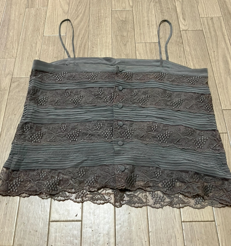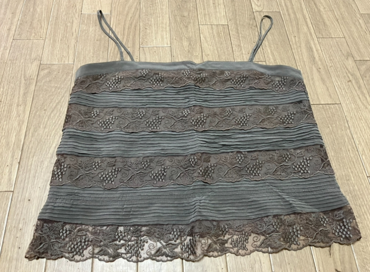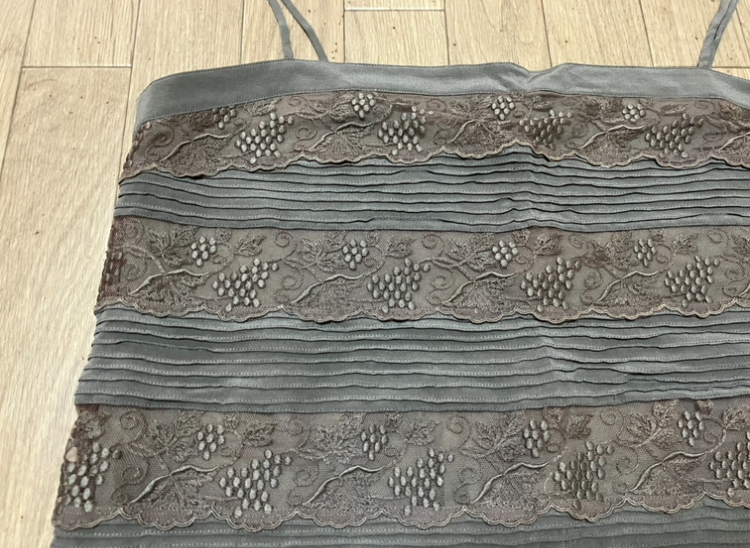 透け感のある素材と、模様がキレイなレース×ボーダーに縫われたグレー地のオシャレなキャミです。