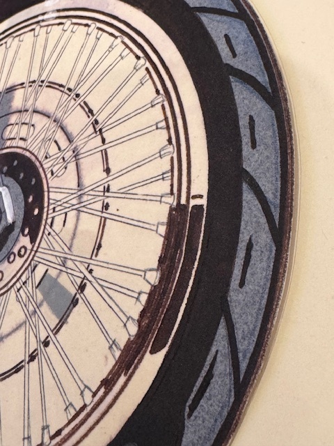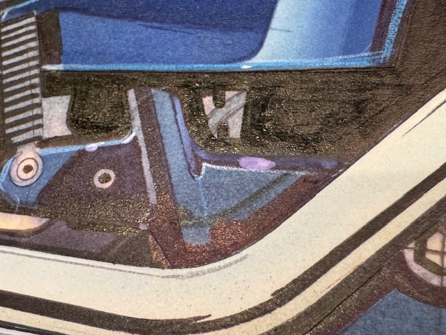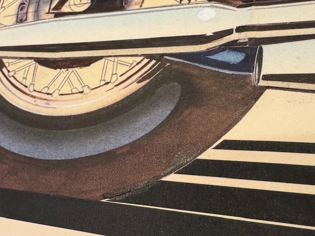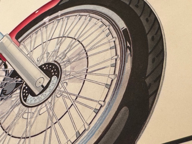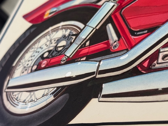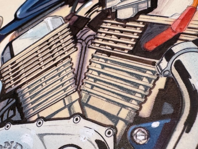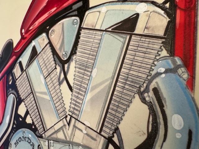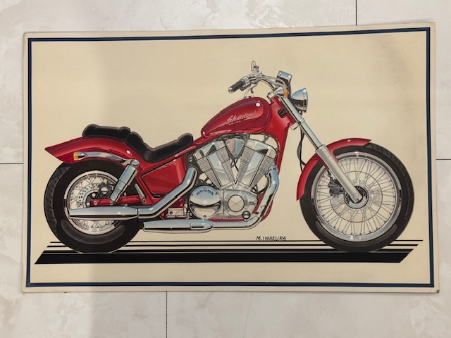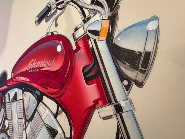 Hondaの プレスリリースは勿論、カタログ、二輪専門誌などに掲載されたイラスト原画そのモノです。デザイナーは故、岩倉正登さんです。イラストにもサインが記されています。このモデルをデザインされた際はアメリカンの研究所に出張されて、ホテルに長期滞在し、昼夜構わずに書き続けたそうです。何度となく評価会を経て、修正を受けた箇所だけを再度描き直して部分貼りをしたり、重ね描きをしたりと、苦労の跡がハッキリと伝わって来るレンダリングです。