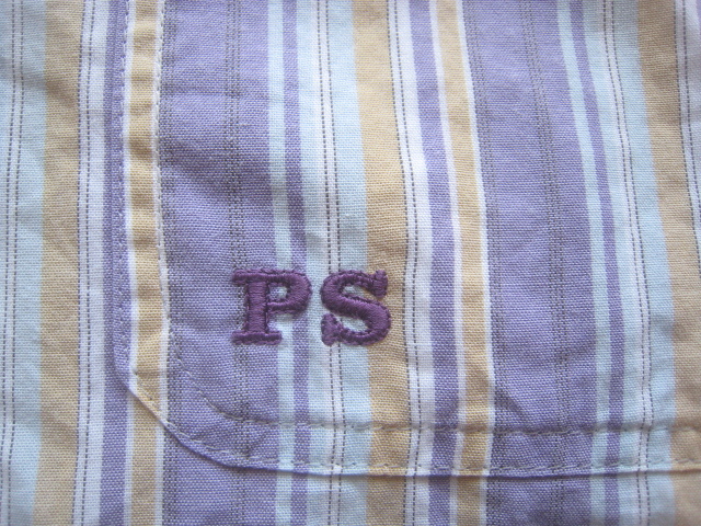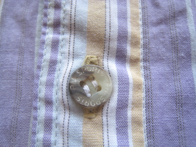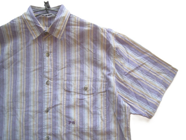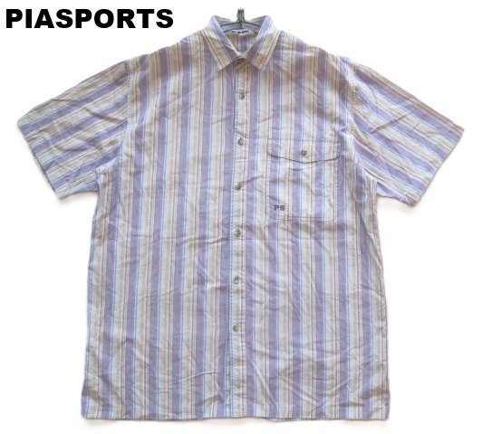 日本製2.2万!!ピアスポーツ PIASPORTS*ロゴ刺繍 胸ポケット付き ストライプ柄半袖シャツ 3 実寸M 紫×白×モカ×水色 ライカ RAIKA