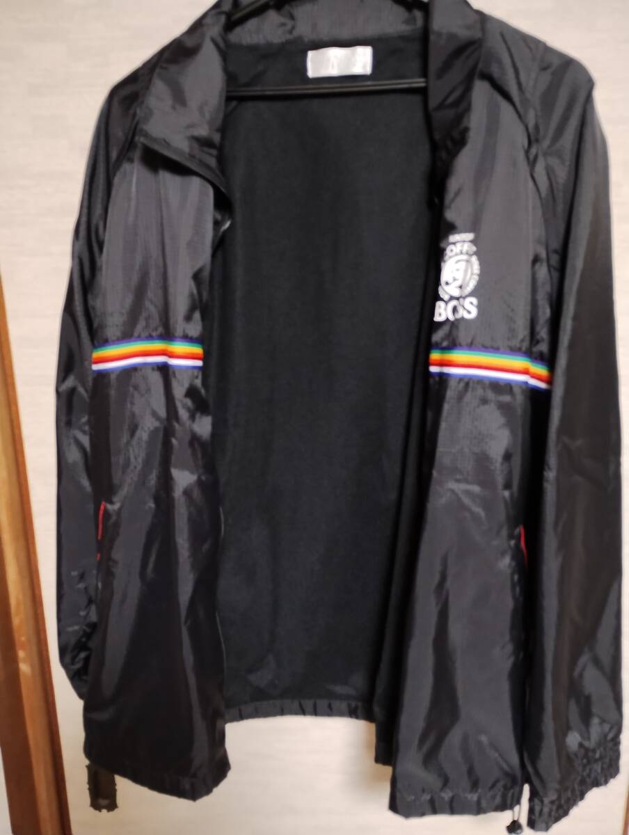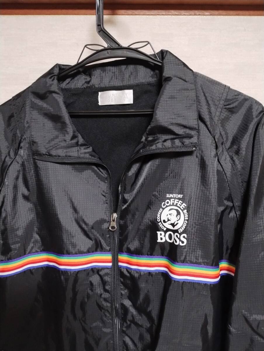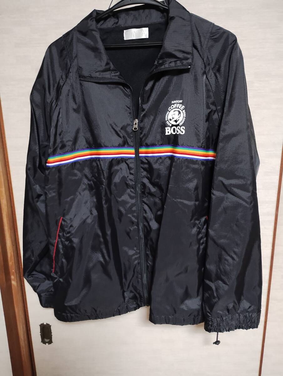 超希少、BOSSオリジナルデザインのナイロン素材のブラックジャケット、ストライプデザインとジッパー付き。
