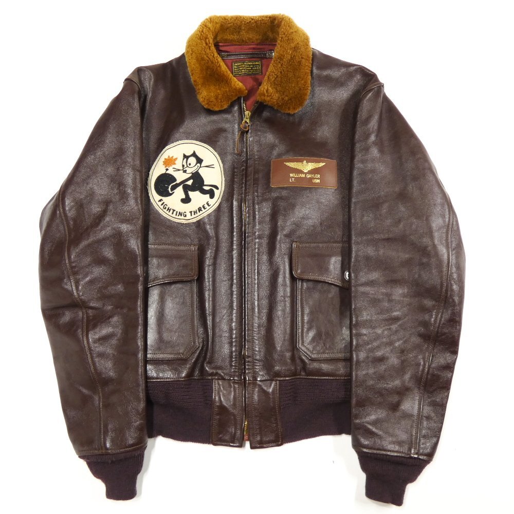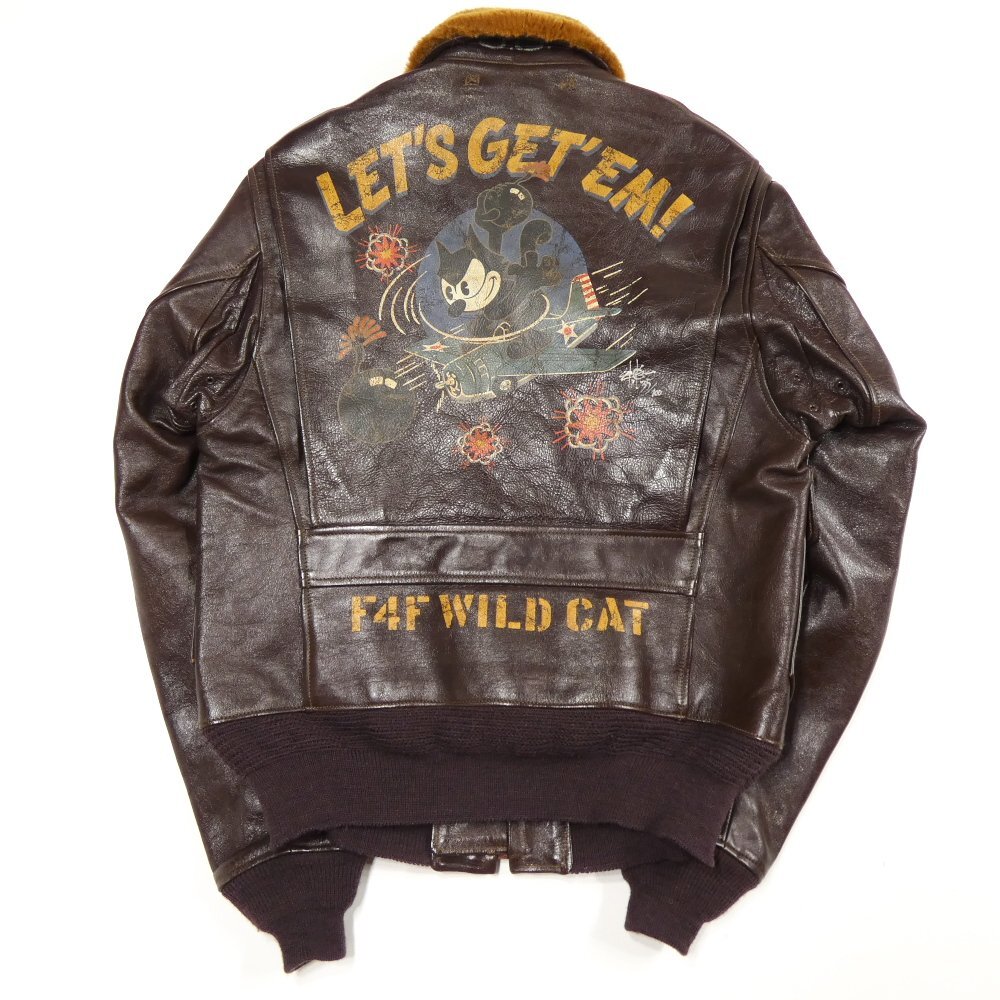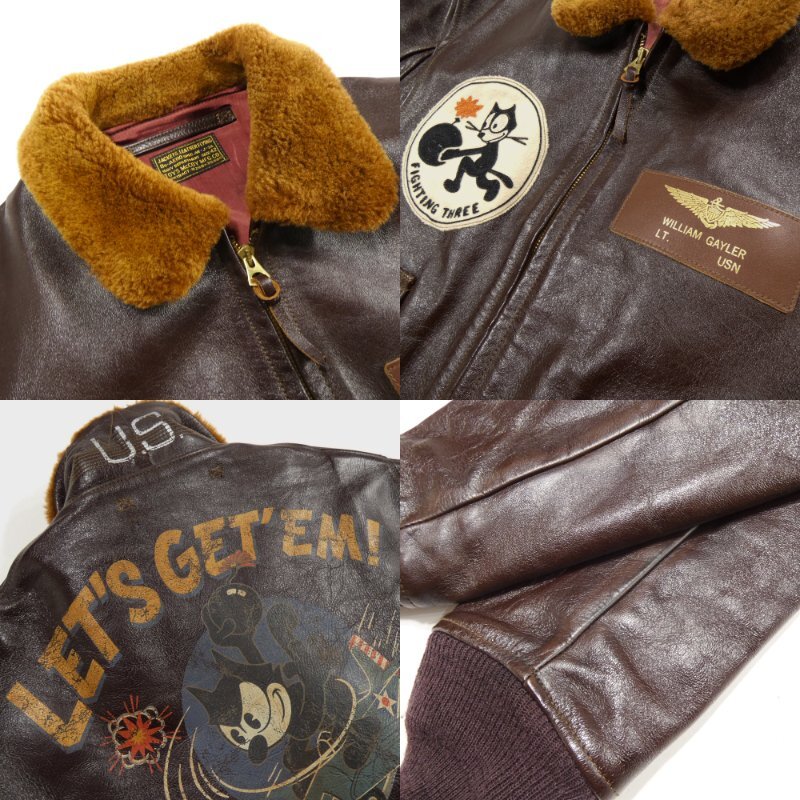 ほんの数時期しか採用されなかった陸軍と海軍共有のフライトジャケット AN-J-3Aのカスタムモデル。 急降下、防弾性能に優れた特性を活かして活躍したグラマン F4F ワイルドキャットに跨り、 爆弾を投げつけるフィリックスのバックペイントとVF-3のスコードロンパッチ、 箔押しによるレザー製ネームプレートを配しています。 対空砲火をかいくぐり、爆弾を投げつけるフィリックスを描いたバックプリント。 岡本博氏のサインと全サイズ計100着のシリアルナンバーが入ります。 |