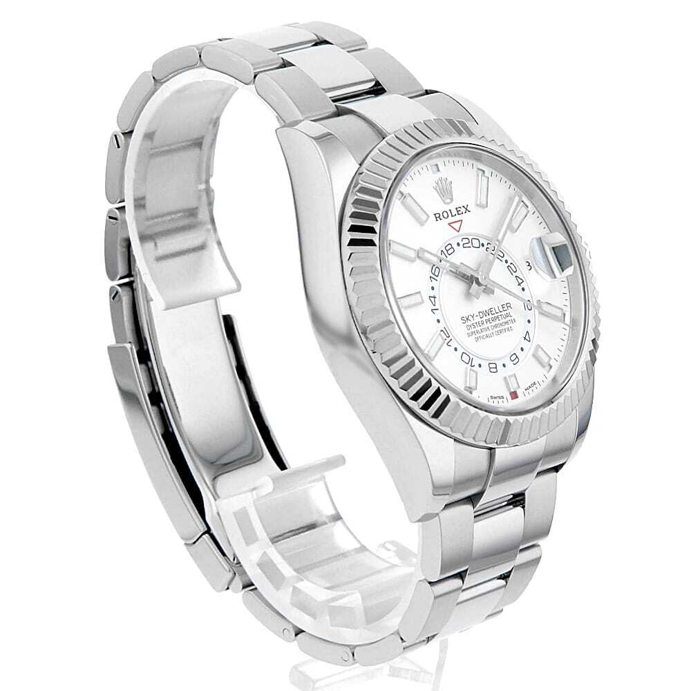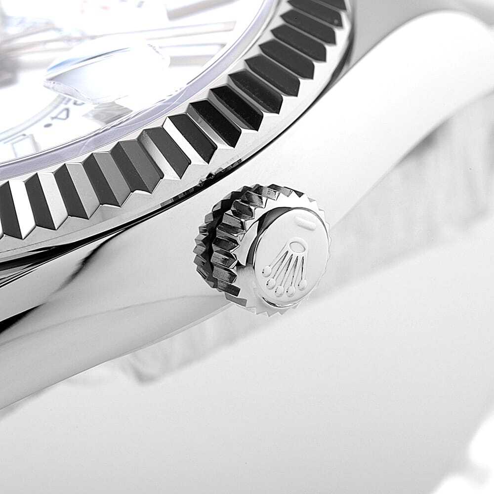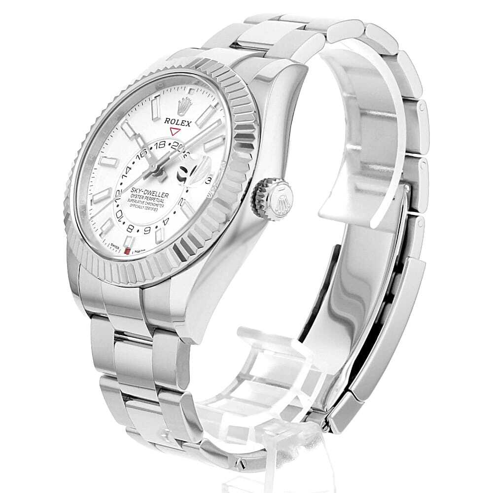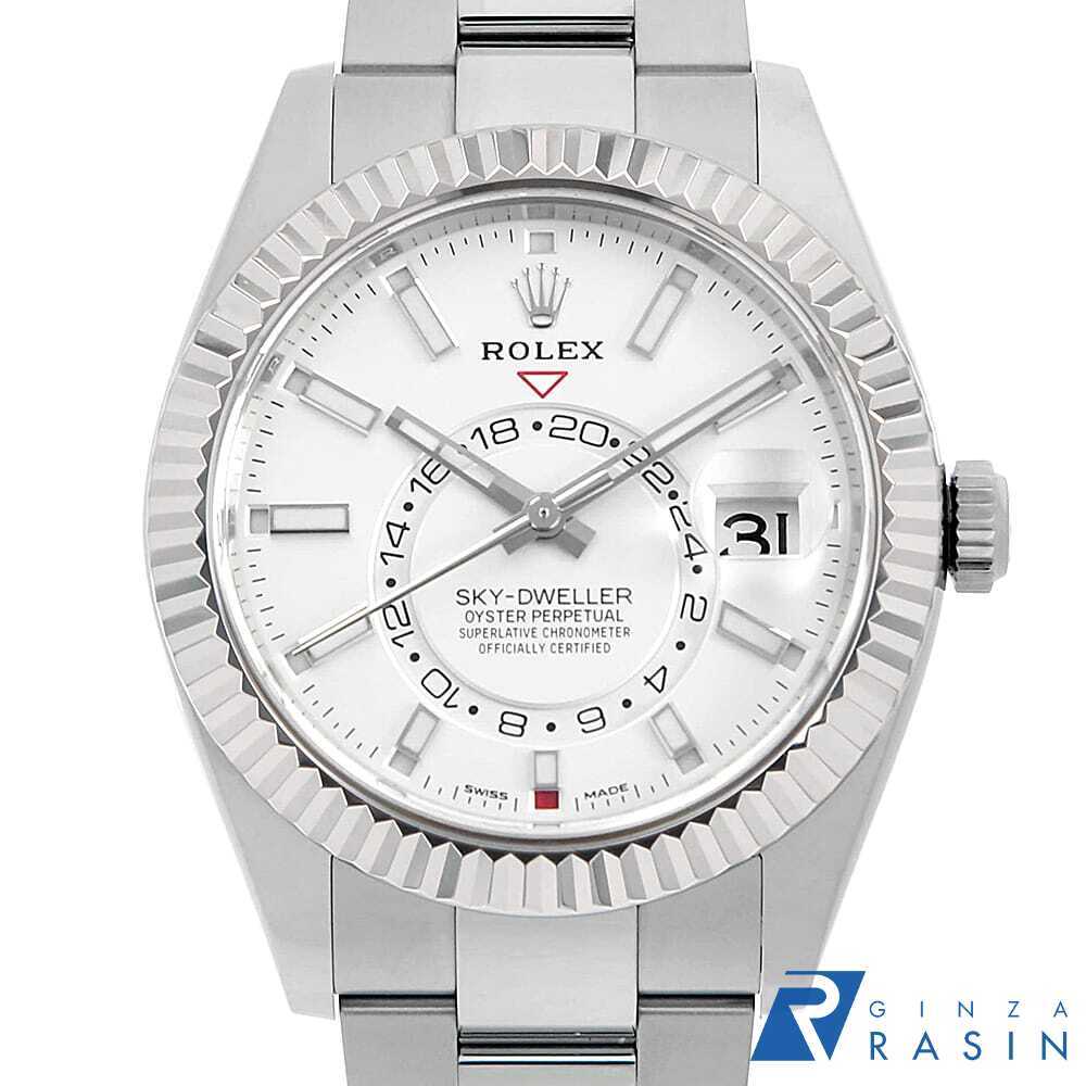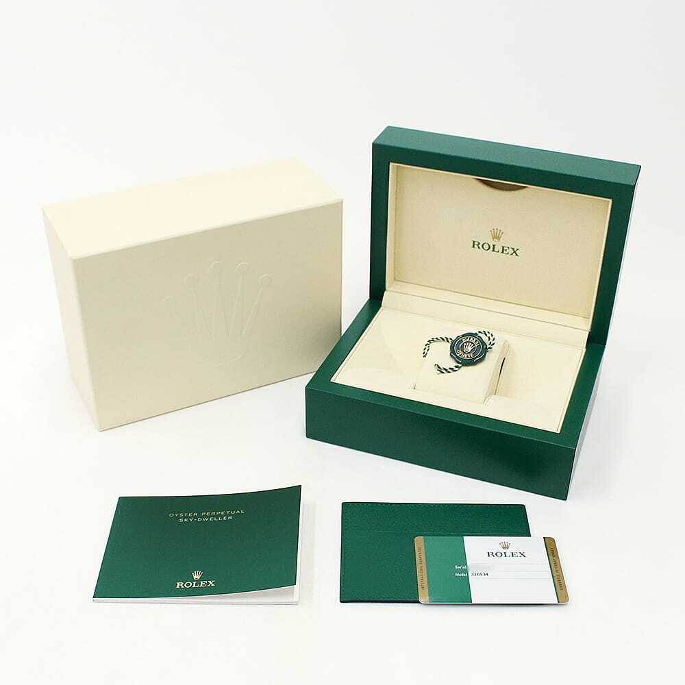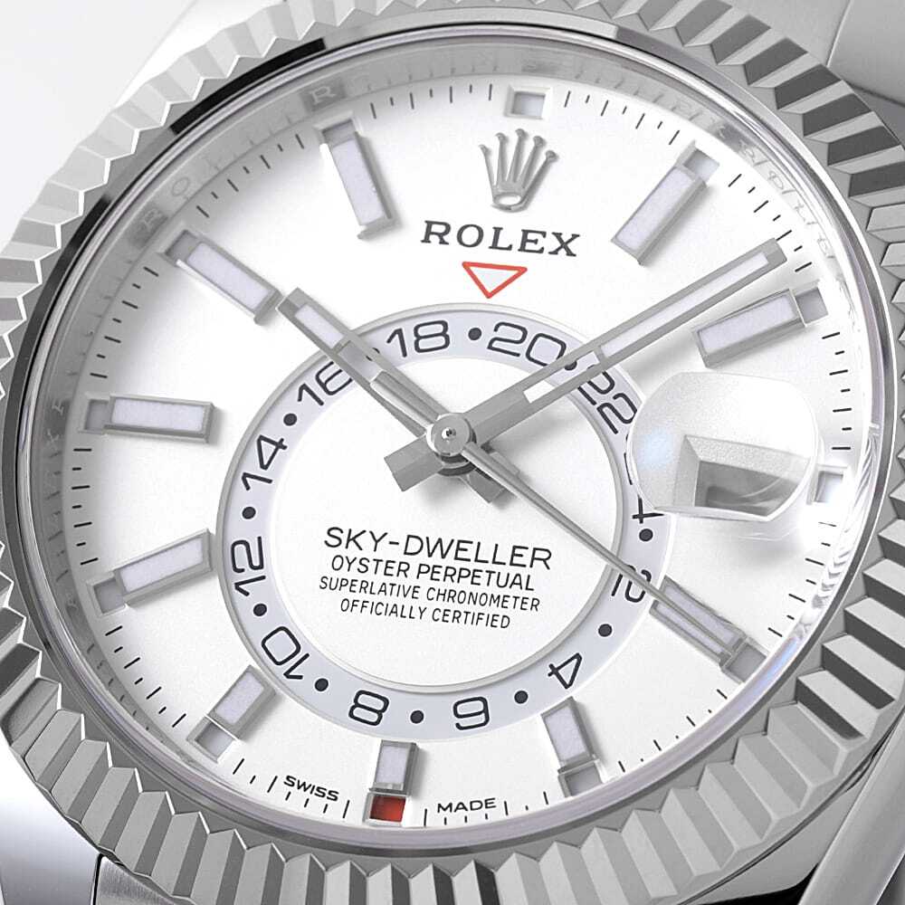 モデル情報 | バーゼルワールド2012で最も話題を集めた、ロレックスのモデル”スカイドゥエラー”を入荷いたしました。ムーブメントには380のパーツと7つの特許技術からなるCal.9001を搭載。文字盤中央で目を引くGMTディスク。GMTマスターとは異なりディスクが回転することで赤い逆三角形のマーカーから第二時間帯(ホームタイム)を読み取ります。また「サロス」と名付けられた年次カレンダー。文字盤外周の小窓で月を表し、3時の小窓で日付を表示。小の月の終わりに31日を飛ばす機構を持っています。リューズの二段引きを排し、リングコマンドベゼルを搭載。パーツへの負荷を減らし、ローカルタイム/ホームタイム/月・日付の変更を容易にしました。実用性と機能美を兼ね備え、ロレックスの革新性を感じさせるコンプリケーションモデルとなっております。 |