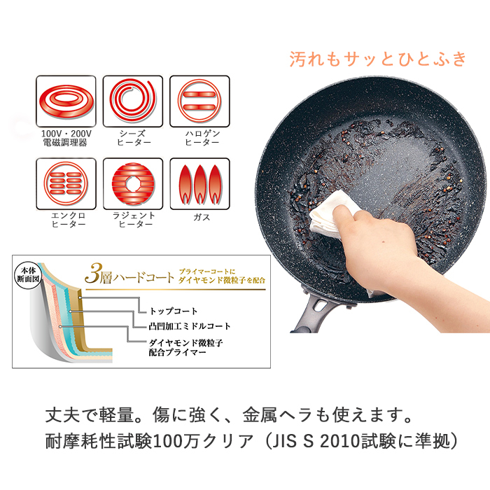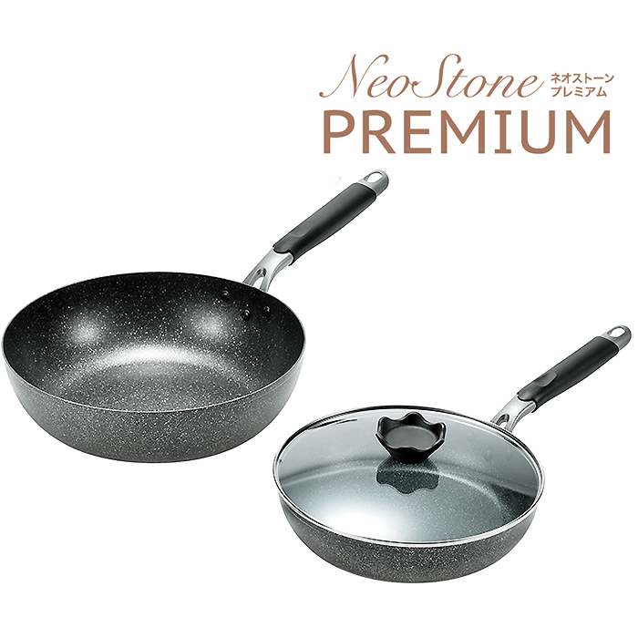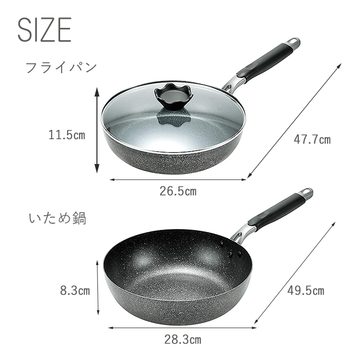 丈夫で軽量。キズに強く、金属ヘラも使える26cmフライパン(ガラス蓋付)と28cm炒め鍋のセット。