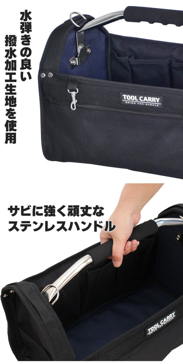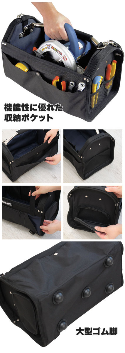| ハンドルが左右に倒せるので工具の出し入れが簡単なツールキャリーです。 サビに強く頑丈なステンレスハンドル付き。 コンパクトなボディにかさばる工具をたっぷり収納できます。 着脱式カバー付き。 ショルダーベルト付きなので持ち運びに便利です。 |