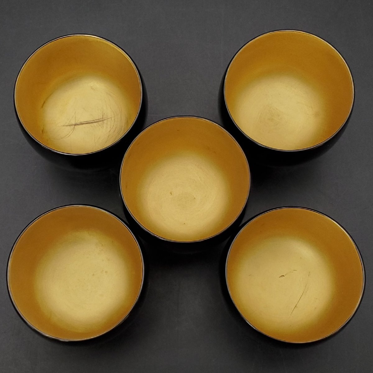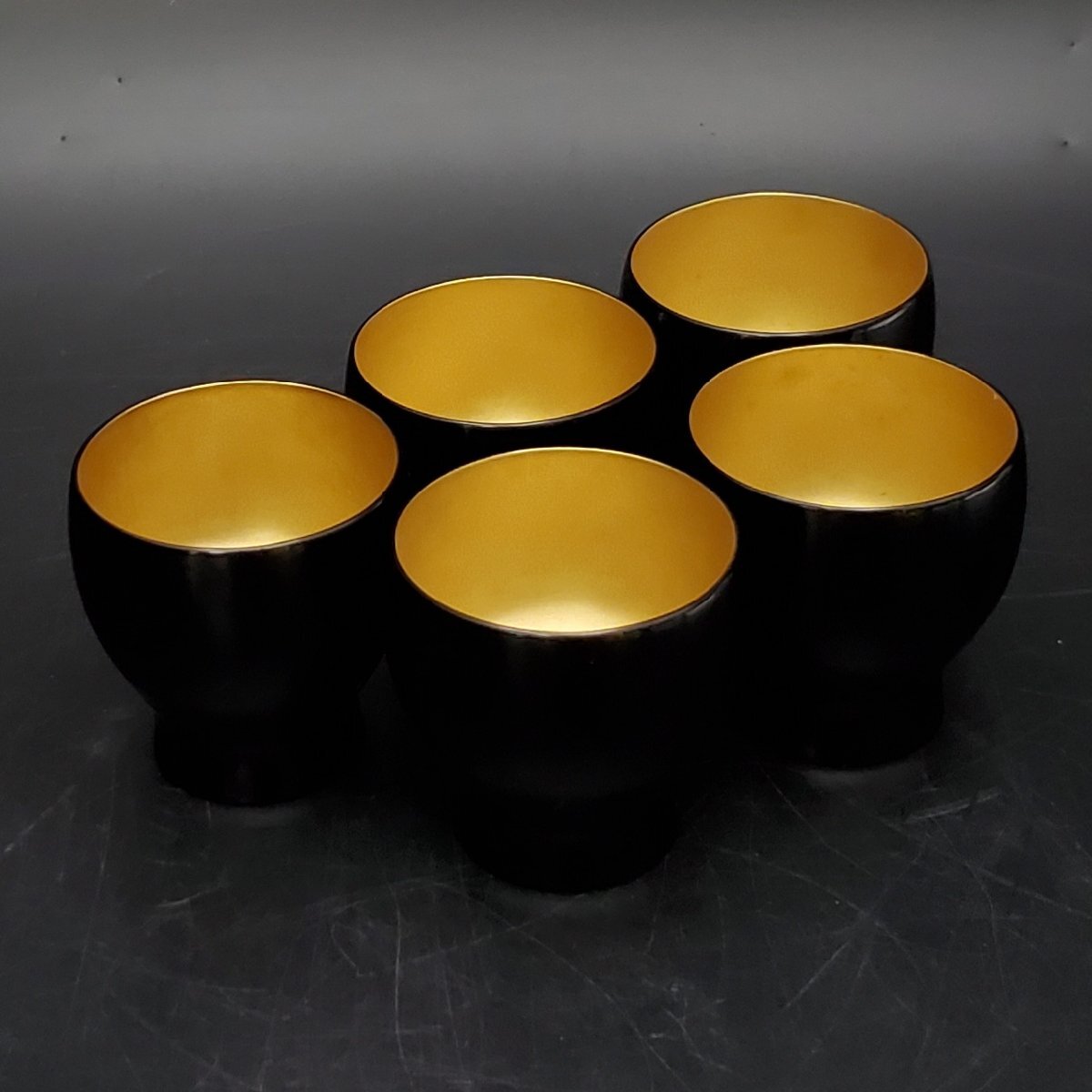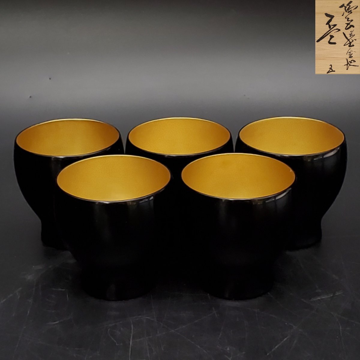 【宝蔵】輪島塗 黒塗内金地 酒盃 杯 5客 口径約5.5cm 酒器 共箱