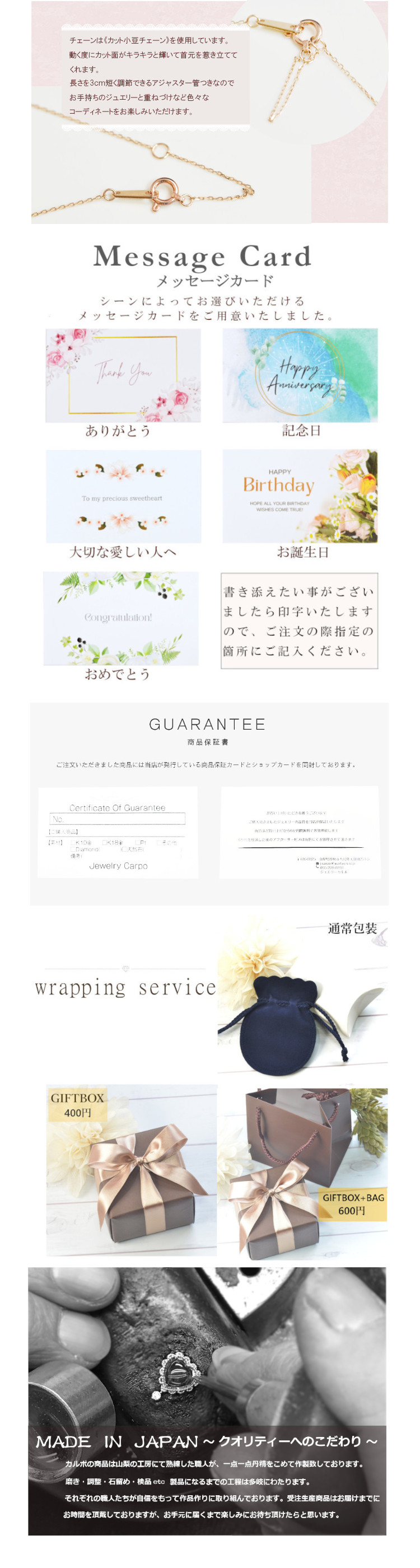 | その他 | こちらの商品はご注文を頂いてからお時間を頂き、一つ一つお作りする受注生産商品です。 自分用 普段使い はもちろん 誕生日 母の日 クリスマス 記念日 等 贈り物 にも最適です。 全国送料無料 ※なるべく実物の色あいに近づけるように心がけて撮影していますが、モニター環境によって素材感や色合いが若干異なる場合がございますのでご了承ください。 ※ジュエリーはとてもデリケートです。入浴やスポーツ、家事をするときはお外し頂く事をお勧めいたします。 また、汗や温泉、化粧品やフレグランスなどは変色や劣化の原因となりますので取り扱いにはご注意ください。 |