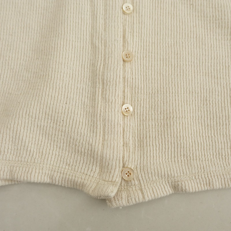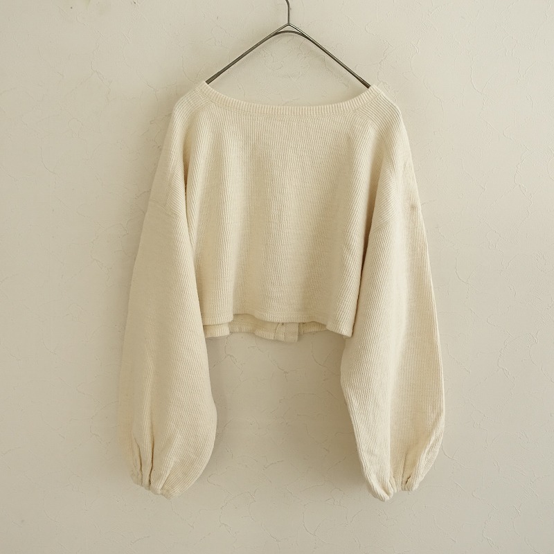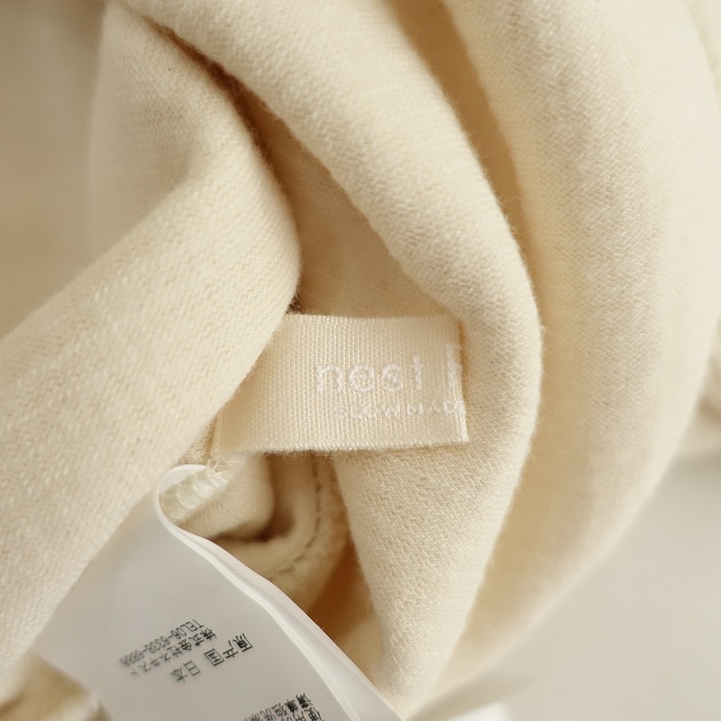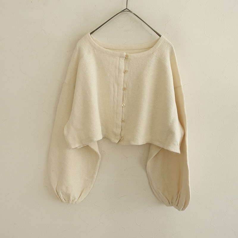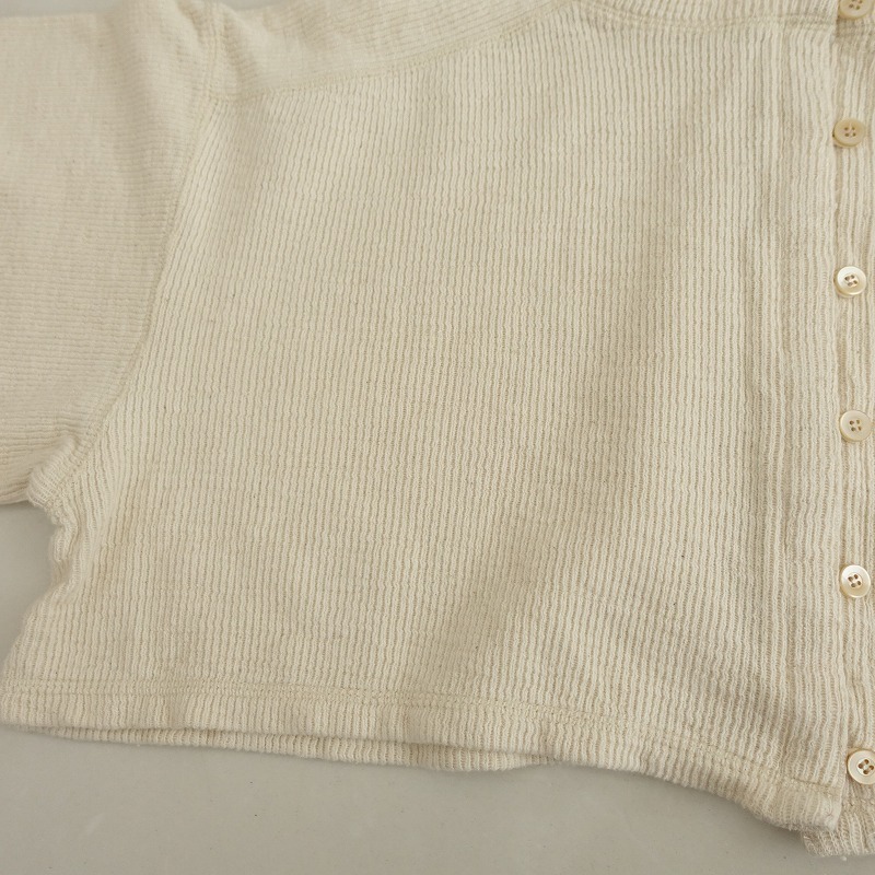 | 2023年コレクション nest Robeのコットンクォーターゲージショートカーディガンです。カラーは生成り(ブランド表記カラーはオフホワイト)で、コットンニット地です。ショート丈の前後2WAYデザインで、ループボタンで着脱でき、袖口ゴム入りです。定価(メーカー希望小売価格)15,400円の商品です。 |
