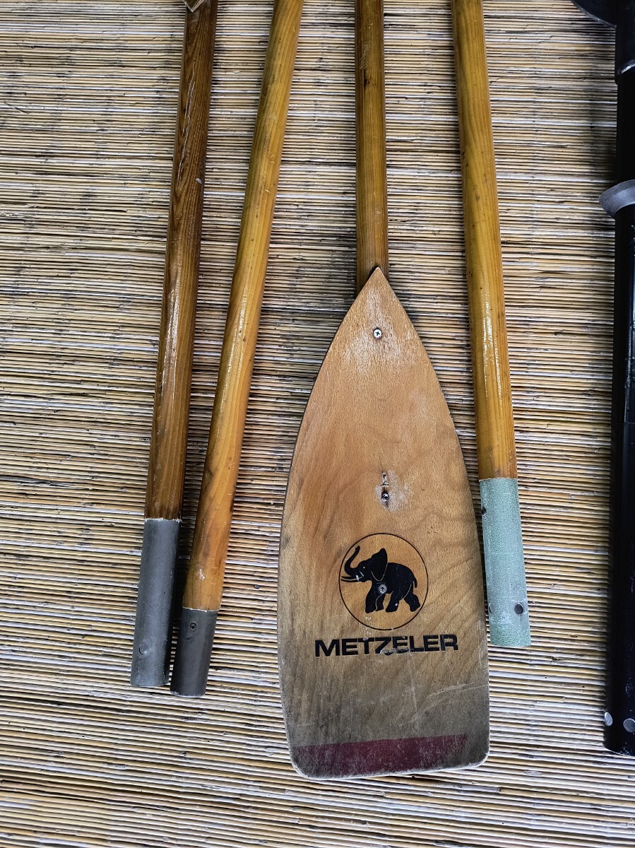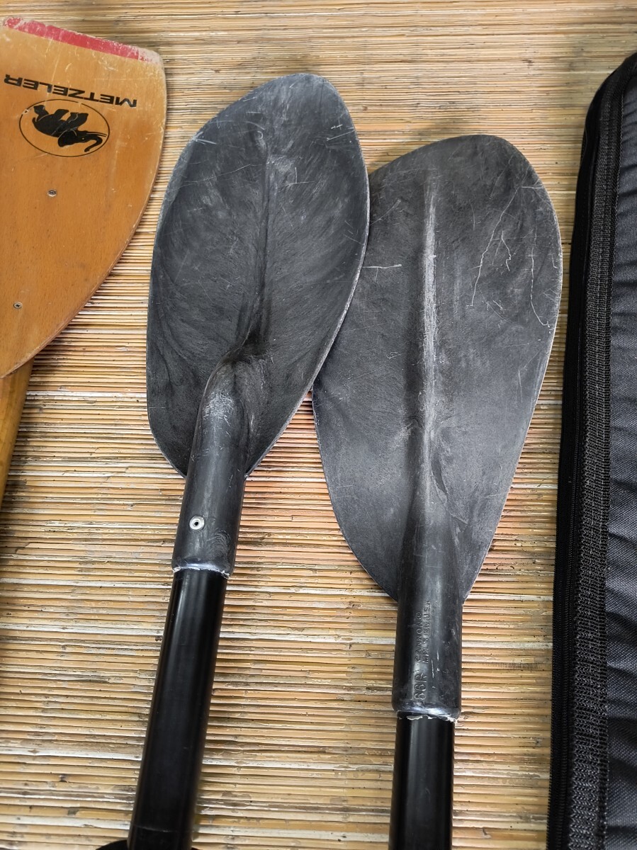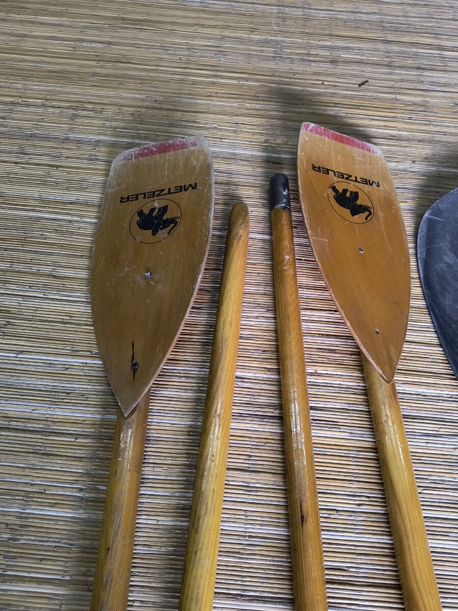 パドル2本とパドルバッグです。いずれも1995年頃の中古品です。METZELER木製パドル:1993年ドイツ製。2組ありますが1本の片側の水掻きが欠損しています。防水合板で成形すれば修理可能です。19㌢X225㌢約1㎏。