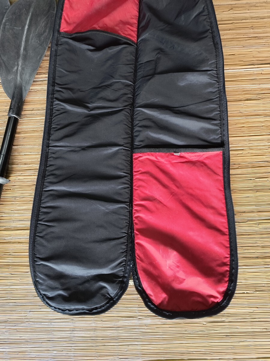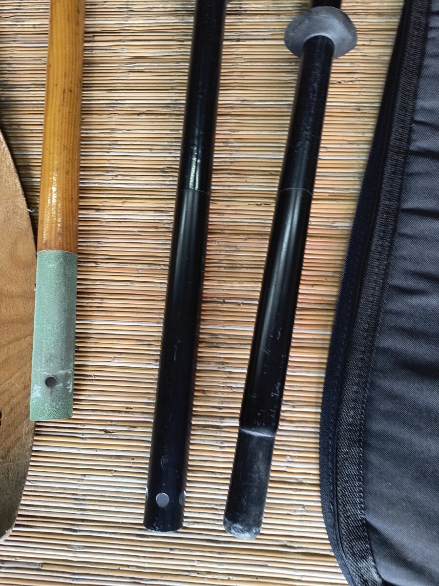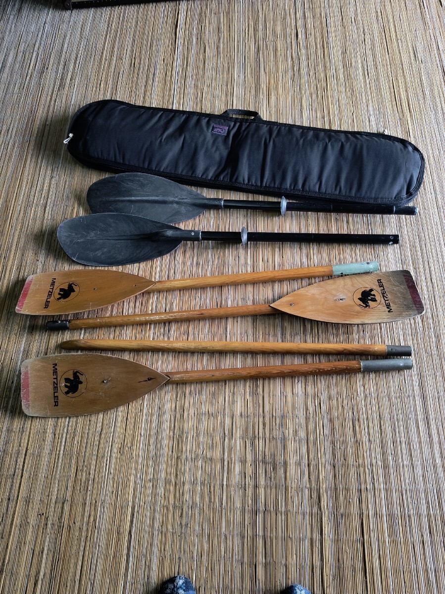 パドル2本とパドルバッグです。いずれも1995年頃の中古品です。METZELER木製パドル:1993年ドイツ製。2組ありますが1本の片側の水掻きが欠損しています。防水合板で成形すれば修理可能です。19㌢X225㌢約1㎏。