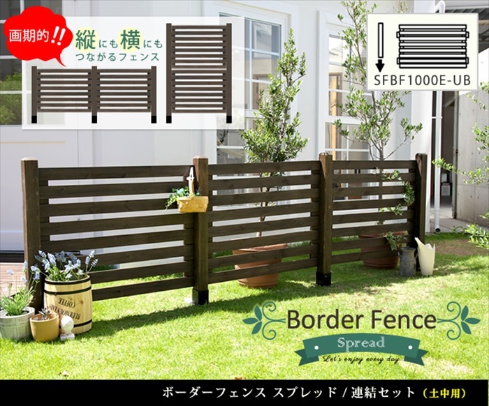 | 【ボーダーフェンス スプレッド(連結セット/土中用)】 新鮮!見栄えが違うボーダーフェンス自分で木製フェンスを設置するなら、断然ボーダーがおすすめです。 爽やかでナチュラルな雰囲気があり、モダンにも、スタイリッシュにも、フレンチカントリーにもマッチする使いやすさが魅力。 ボーダーの間隔が絶妙で、圧迫感がなく、ほどよい目隠しとなるので、防犯に役に立ちます。 気軽に花の水遣りができますね。 小さなお子さんも、お庭で安心して遊べそうです。 自分で手がけた愛着のある簡単DIYフェンスで、癒しのプライベートガーデンを作りませんか。 |