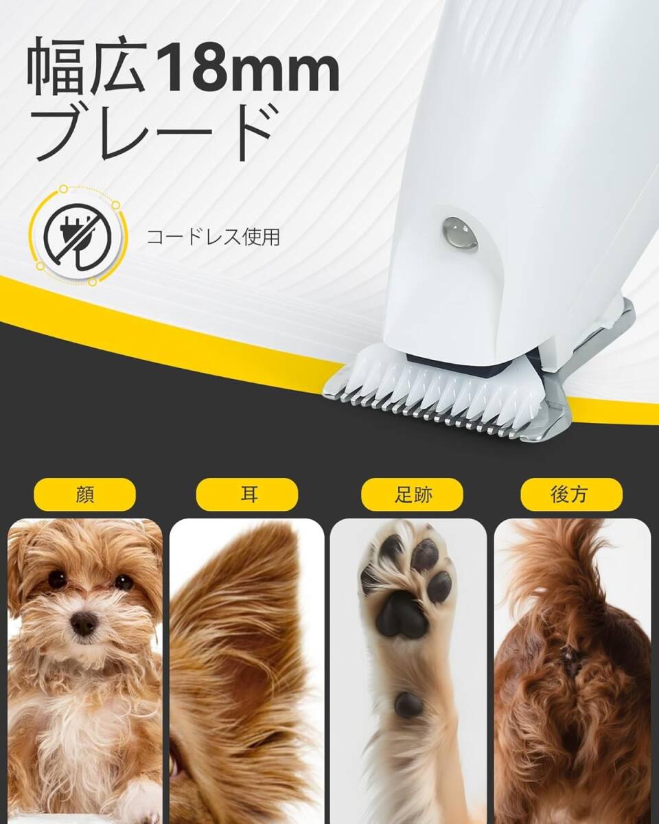 狭い部分も広くカバーできる18mm幅ブレード。ブレード付近の明るいライトで足裏・顔・耳・お尻を照らし、安全で正確なトリミングが可能です。