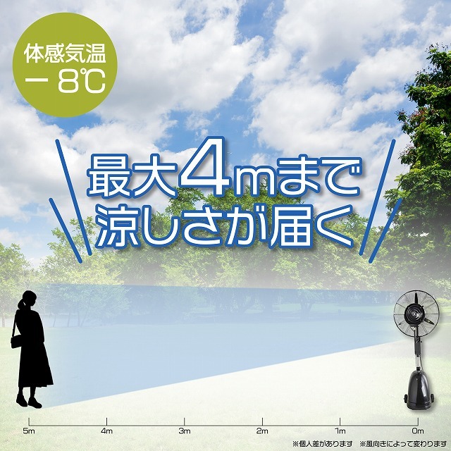 ■ ミストが蒸発する際の気化熱による冷却効果で、体感温度を約5-8℃下げる効果があります。