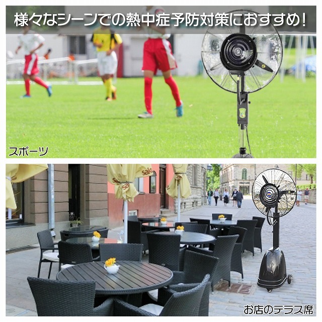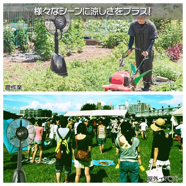 ■ 人が集まる場所や作業現場、イベント、スポーツ観戦、運動場、畜舎、鶏舎などの熱中対策として幅広く使えます。