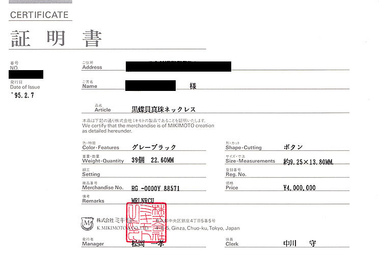 商品名ミキモト 黒蝶真珠(南洋真珠) ネックレス ダイヤモンド K18ホワイトゴールド MIKIMOTO 連 Mチャーム付き