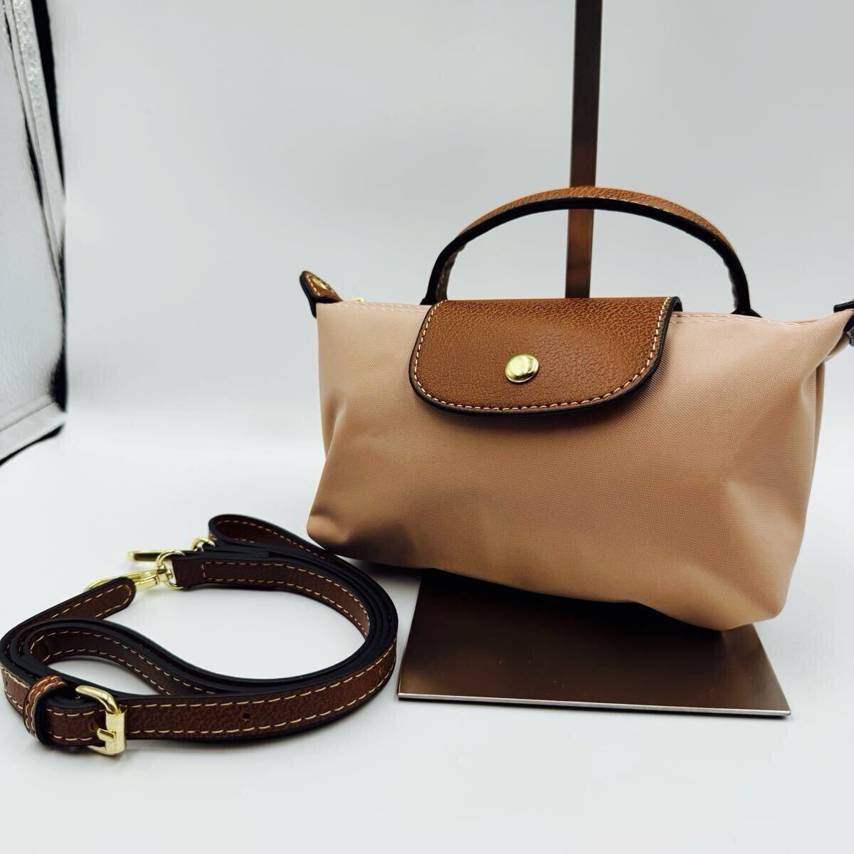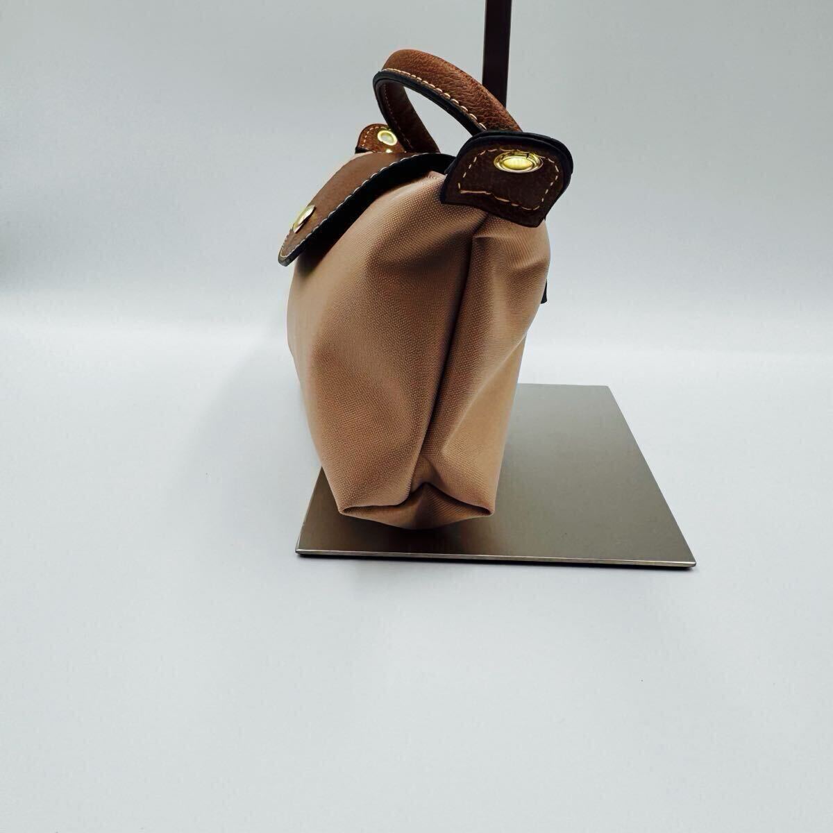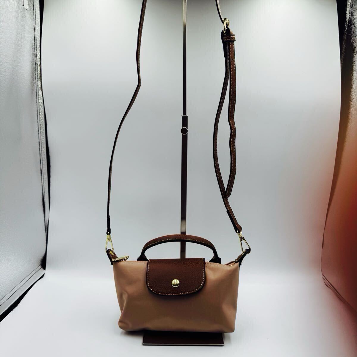 ブラウンのナイロン素材とフェイクレザーの切り替えが上品な、2WAY仕様のミニショルダーバッグです。