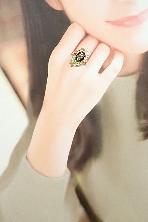 コメント梶光夫の、作家クリスティーヌ・シェロンが描いたエマーユを使用した、優雅なリングです。なめらかな曲線を描くリボンのような優美な枠は、存在感がありながらもしっかりと指に沿うデザインになっています。