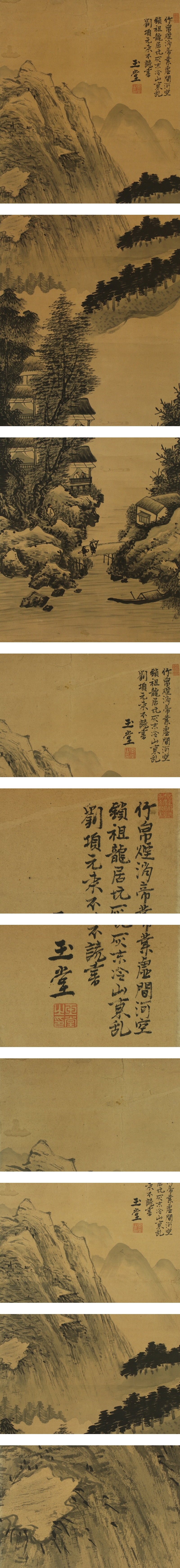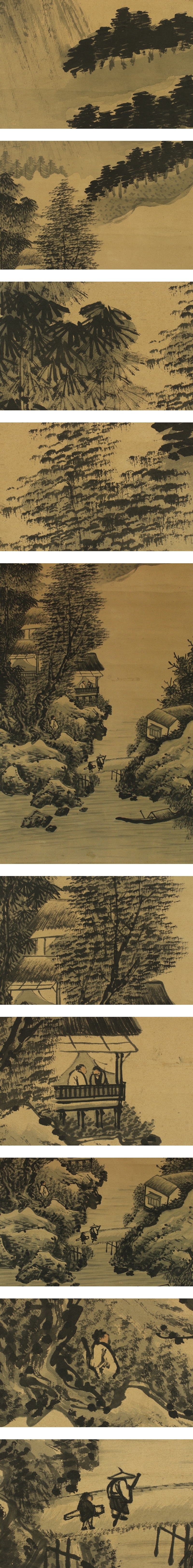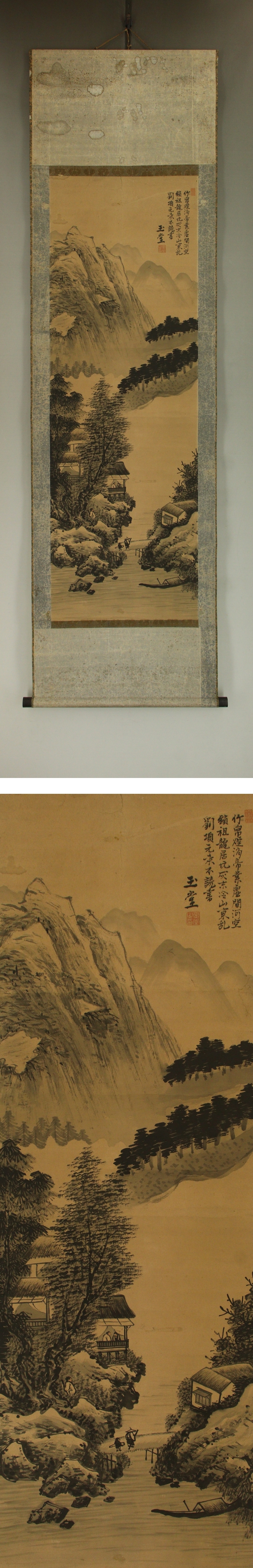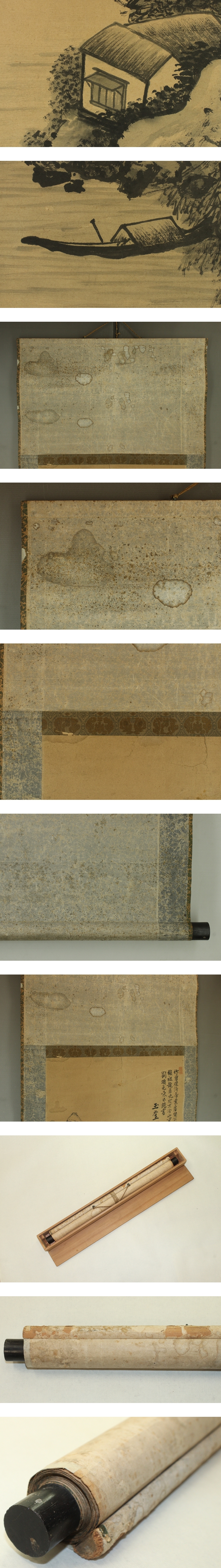 浦上玉堂 うらがみ-ぎょくどう(1745-1820) 江戸時代の南画家。岡山池田藩の支藩鴨方藩士の家に生まれる。 姓は紀,名は弼,字は君輔。七弦琴の名手で,生涯手離さず,自ら玉堂琴士と称した。 自由な文人生活に憧れ,1794年2子を抱いて脱藩, 諸国を放浪して自然の観照を深め,奔放ともみえる独自の山水画風を確立。 本紙は、染み、汚れ、強い折れ、皺、ヤケ、虫食い、生地剥れ、擦れがあります。 表装は、染み、汚れ、強い折れ、皺、ヤケ、虫食い、破れ、ほつれ、擦れ、修理痕、 軸先に汚れ、軸紐に劣化があります。 【サイズ】 作品 横約41.5cm×縦約126cm 表装 横約52.5cm×縦約186cm |