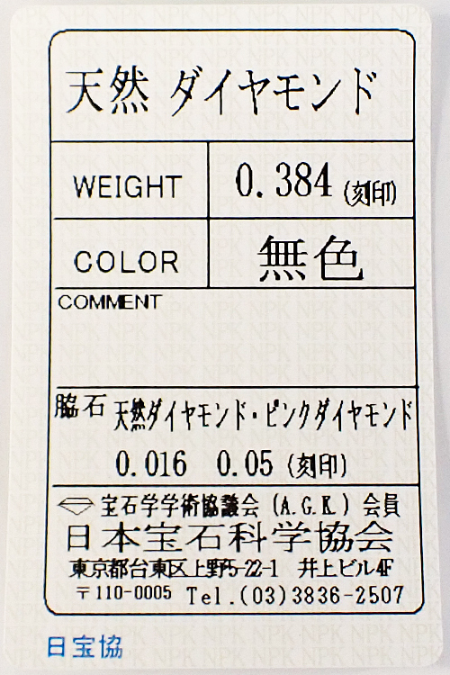 ダイヤモンド色:ピンク、ほぼ無色に近い色合い