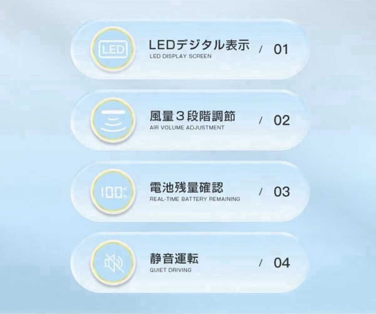 重量 233g 充電時間 3時間で 6時間から10時間使用できます。風の強さにより、使用時間は異なります