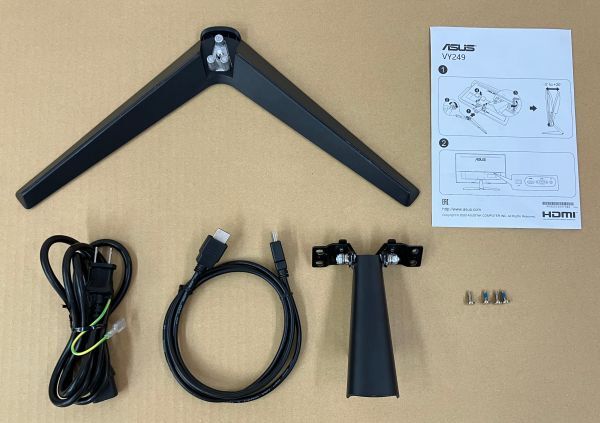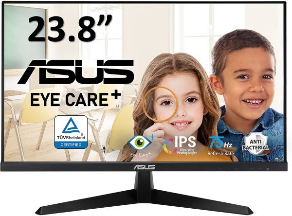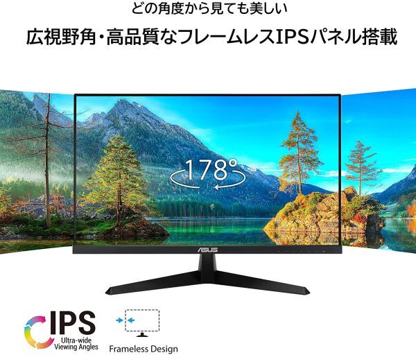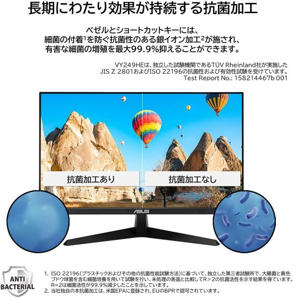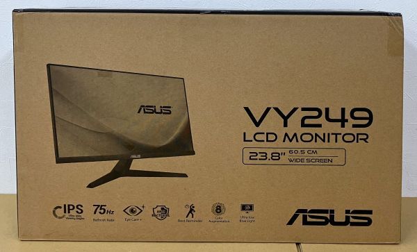 スムーズな動画鑑賞や気軽なゲームプレイが楽しめる、23.8インチフルHD IPSパネルと75Hzのリフレッシュレート 画面のカクつきやチラつき、フレームレートの低下を解消するAMD FreeSync機能搭載 TUV Rheinland認証を取得した目にやさしいブルーライト軽減機能とチラつきをなくすフリッカーフリー技術を搭載 色覚に障害のあるユーザーが色を識別しやすくなるカラーオーグメンテーション機能や、スクリーンタイムの管理に役立つ休憩リマインダー機能を搭載 独自の長期抗菌処理により、モニターのベゼルやショートカットキーに付着した細菌やカビの繁殖を抑制 製品詳細: https://www.asus.com/jp/Displays-Desktops/Monitors/Eye-Care/VY249HE/ 付属品: HDMIケーブル L-shaped Screwdriver 電源ケーブル