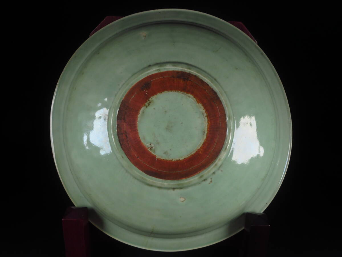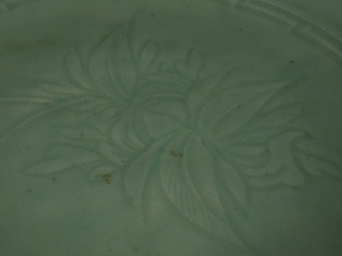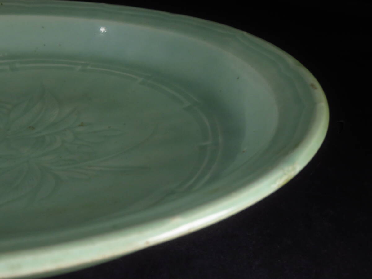 | 【SAKURAYA】コレクター委託品【初期伊万里 青磁陽刻花文大皿】飾皿 飾鉢 珍品 希少品 時代物 箱 骨董品 古美術品 直径37cm | ||