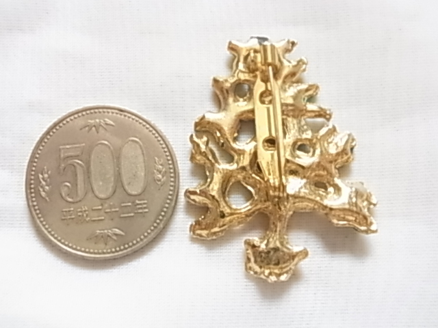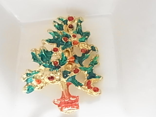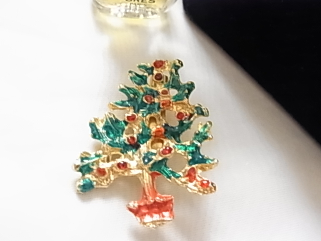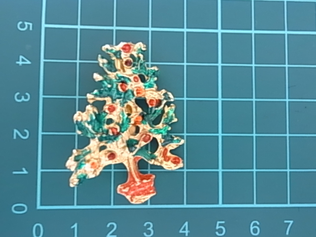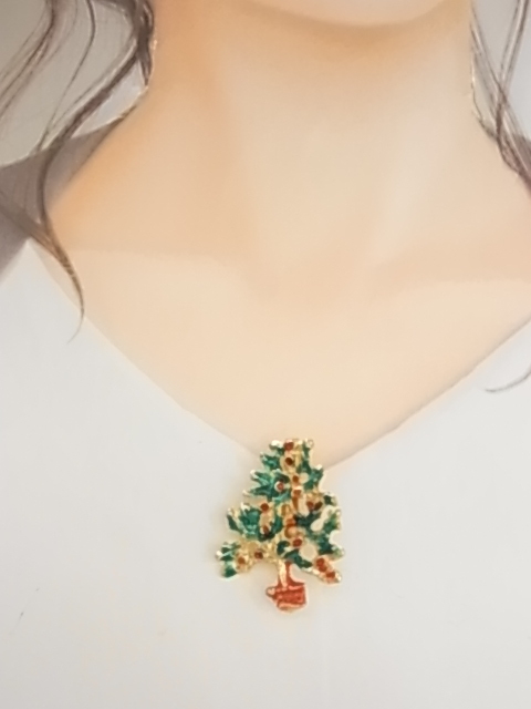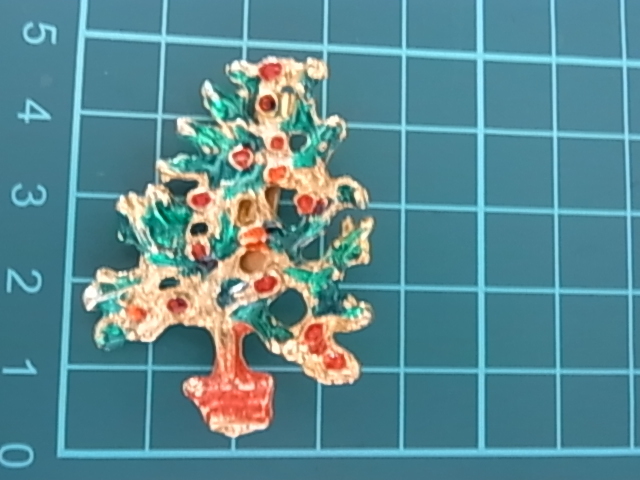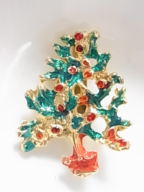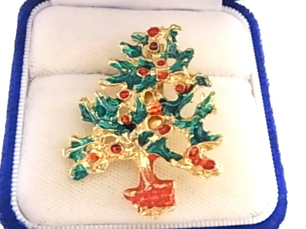 ▲ビンテージ/ヴィンテージ クリスマスツリーのモチーフ Xmasデザイン エナメル装飾加工 ストーンに見える赤と緑の素敵なブローチ
