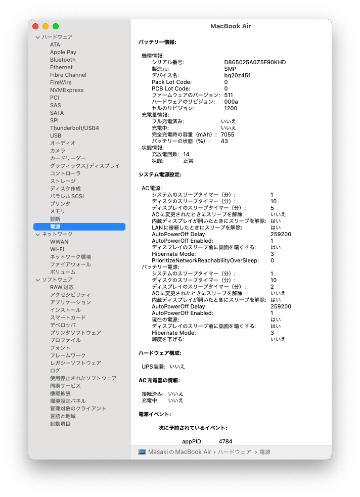 2025年5月にバッテリーをAppleストアにて交換しています。(充放電回数:14回)