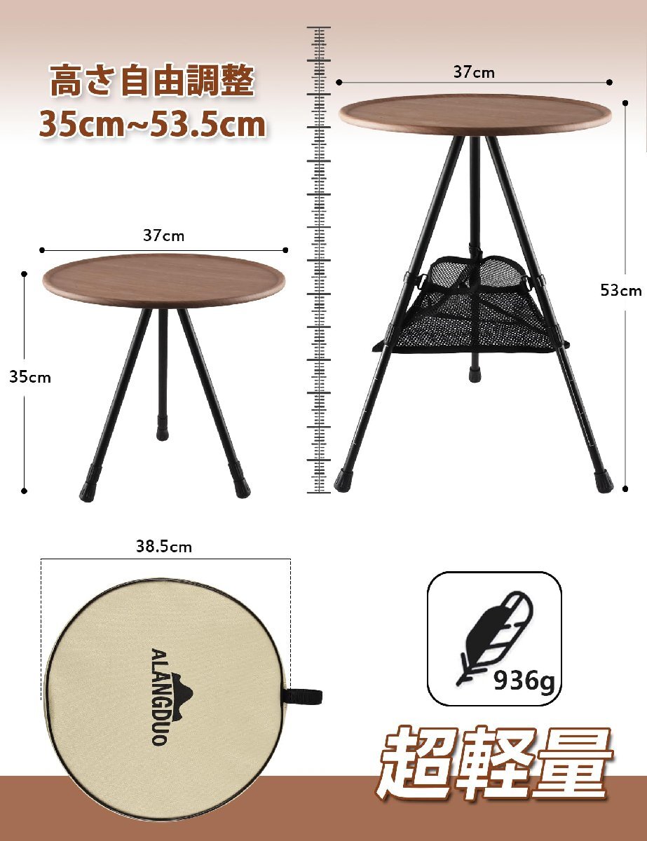 【高さ自由調整】キャンプ用テーブルの脚は自由伸縮調節可能に設計され、35cm~53.5cmの範囲でお好きな高度(5段階)を選択して回転して調整と固定ができます。キャンプ、車中泊などに食事の時は小さくてもテーブルがあると、背中を丸めなくて良いので腰を痛めにくい。コンパクトサイズなので、ソロキャンプやソロツーリングにおすすめです。