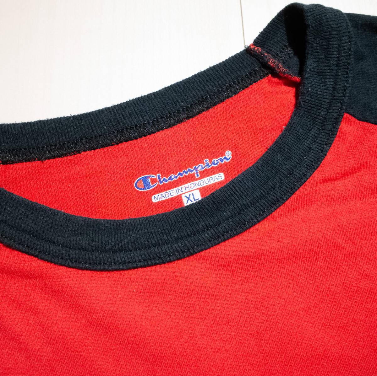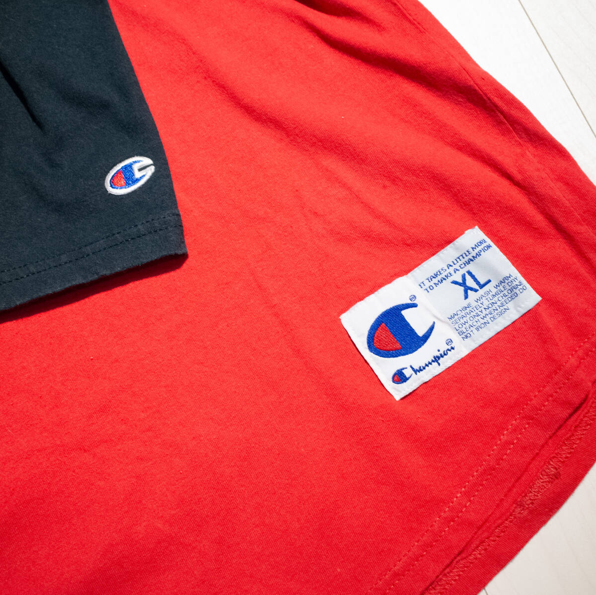 【商品】 CHAMPION チャンピオン Elvis T. Busboyコットン ポリ 七分袖 ラグラン Tシャツ レッド ブラック 古着