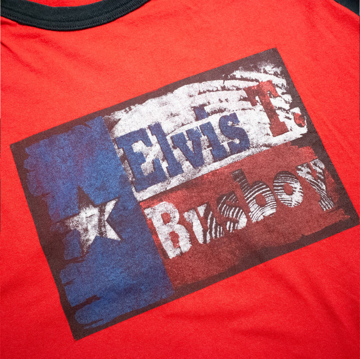 XL / CHAMPION チャンピオン Elvis T. Busboyコットン ポリ 七分袖 ラグラン Tシャツ レッド ブラック 古着 R&B 音楽Tシャツ