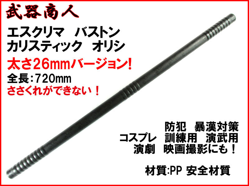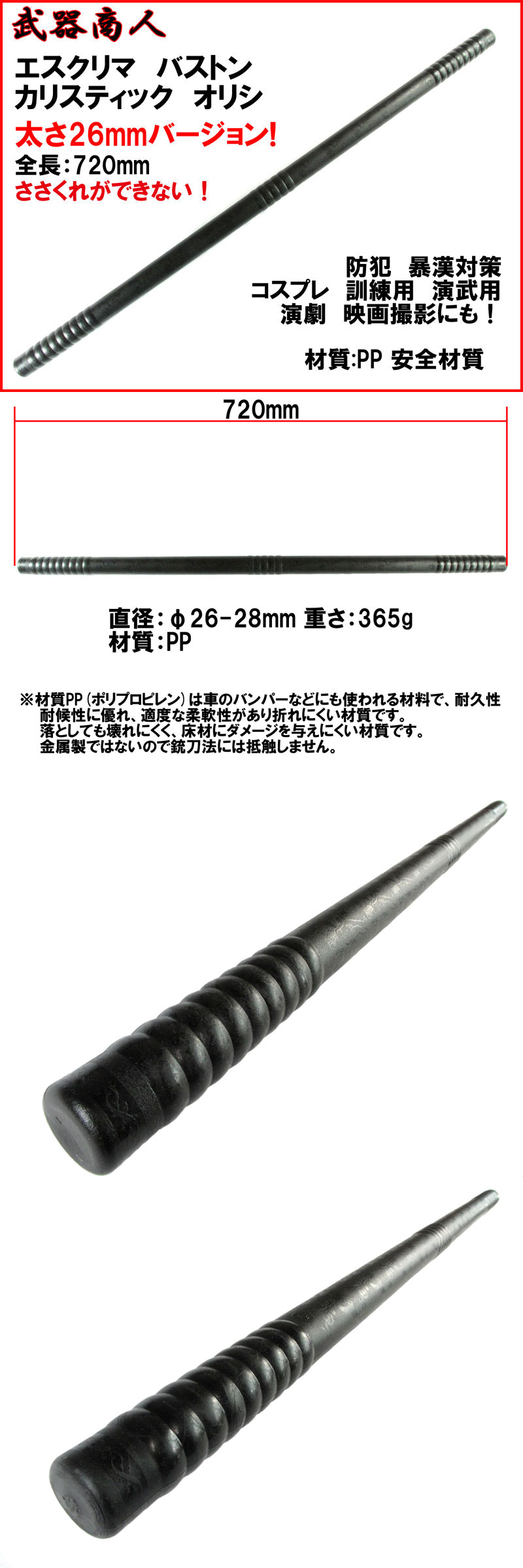 ●太さ26mmの本格的実践的なサイズです!カリ、エスクリマ、アーニス、ジークンドーなどで使われるスティックです。樹脂製ですので長期間使用してもささくれが出来ず手に刺さりません。またとても丈夫な材質ですので、訓練、稽古に最適です。 ●アニメのコスプレ用に!武道の訓練、演武用に!演劇や映画撮影の小道具に!もちろん子供のおもちゃにも! ●材質が金属ではなくPP(ポリプロピレン)の為、銃刀法等の所持規制はありません。コスプレ等で不安なく携帯できます。 ●材質は車のバンパーなどにも使われるPP製。耐久、耐候性が高く落としても壊れにくく、床材も傷つけにくい素材です。 ●長さ720㎜ 太さφ26-28mm 重さ365g |