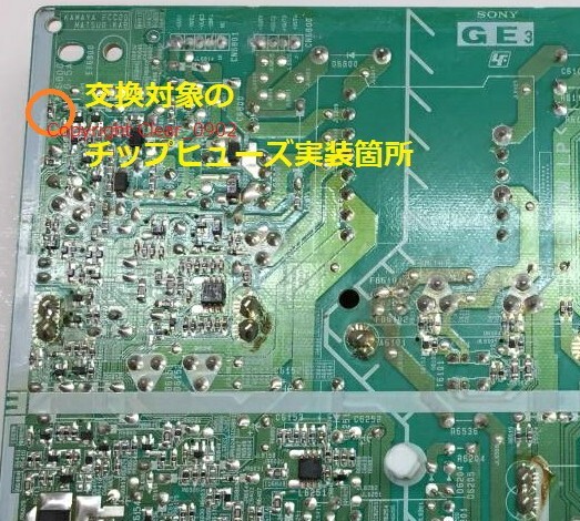 電源ランプが6回点滅する症状が出ている場合は、電源基板裏にある当該部品を交換すれば直る例が多くあります。