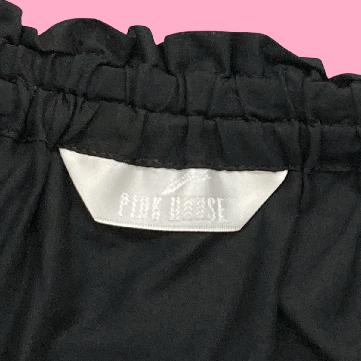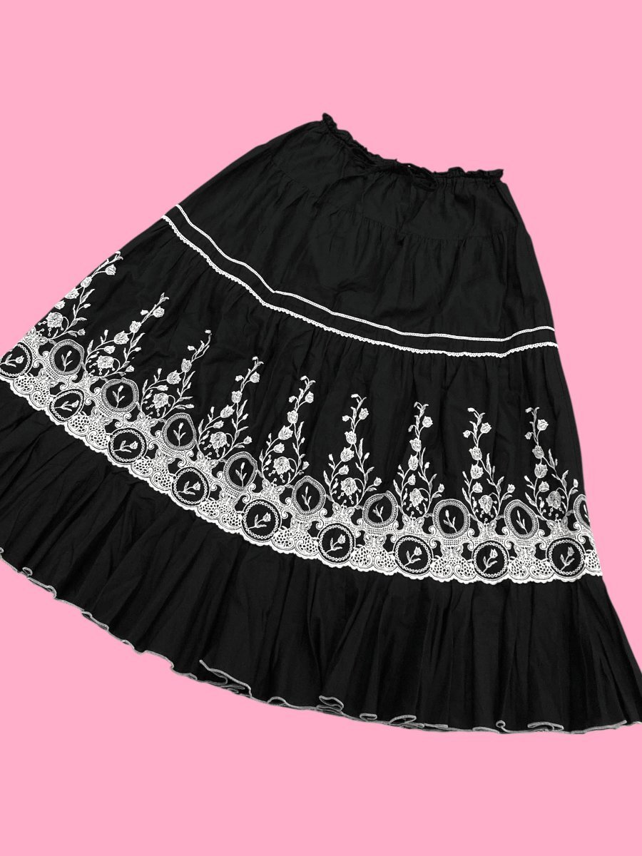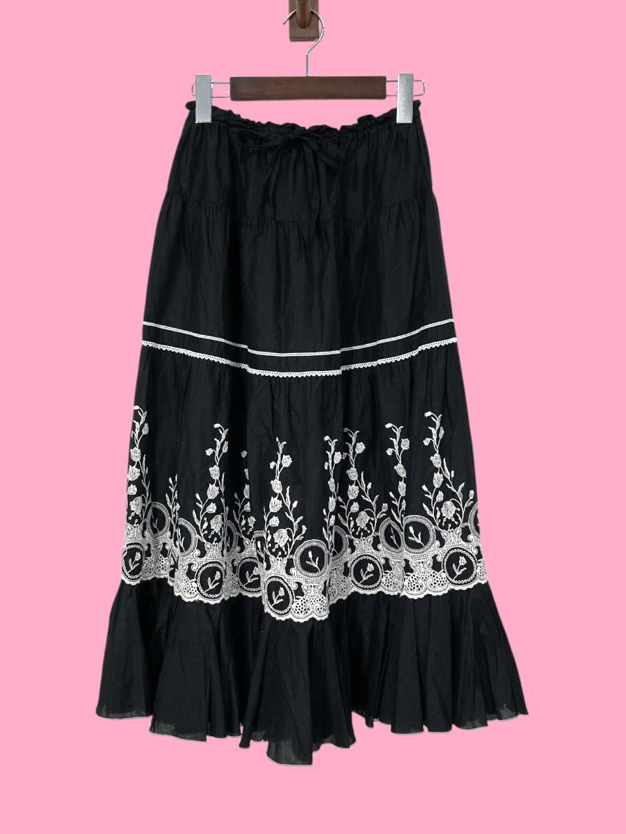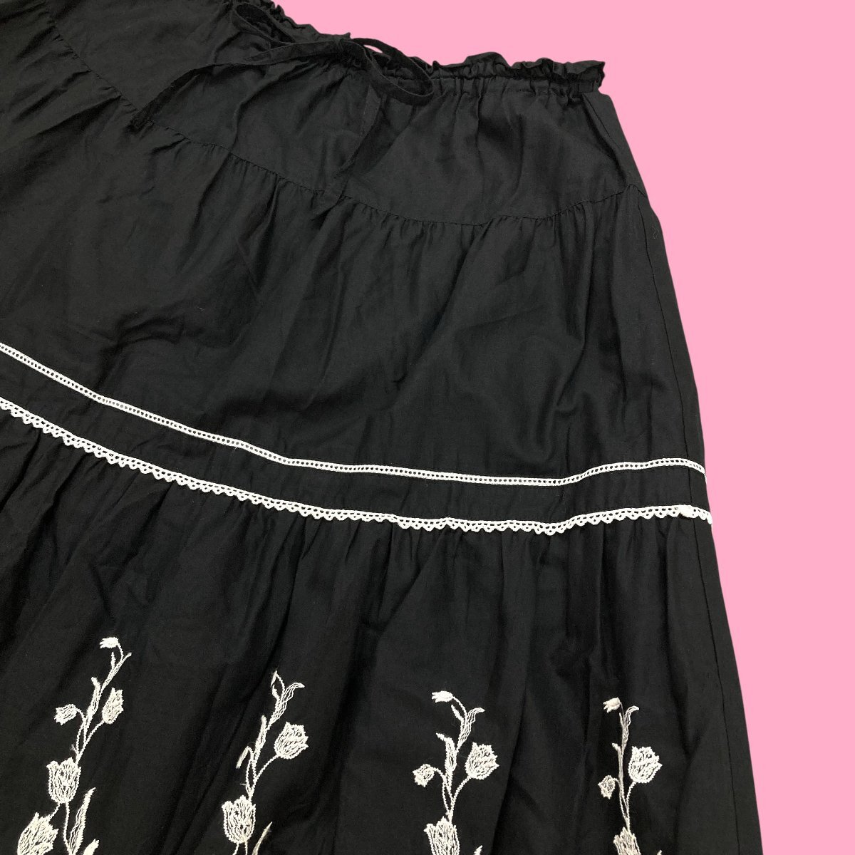 極美品 PINK HOUSE/ピンクハウス フリル使い花柄刺繍フレアスカート 黒 sc607