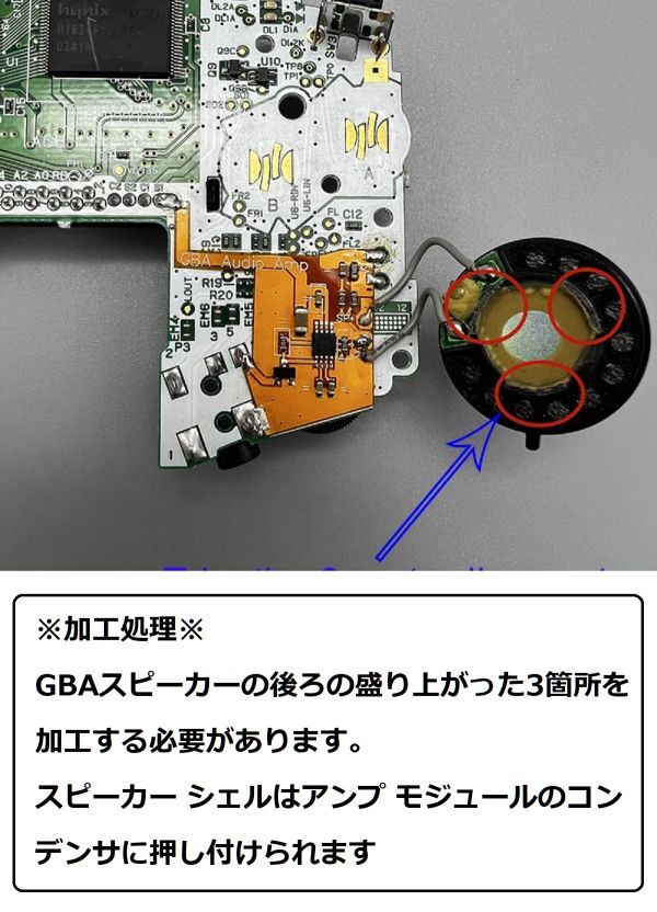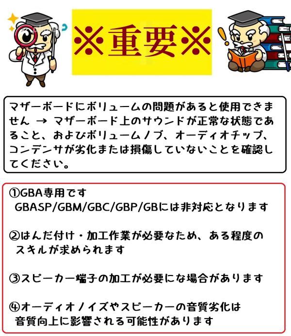 • ※注意※ ①GBA専用(GBASP/GBM/GBC/GBP/GBには非対応)、②はんだ付け・加工作業が必要なため、ある程度のスキルが求められます ③スピーカー端子の加工が必要にな場合があります ④オーディオノイズやスピーカーの音質劣化は,、音質向上に影響される可能性があります