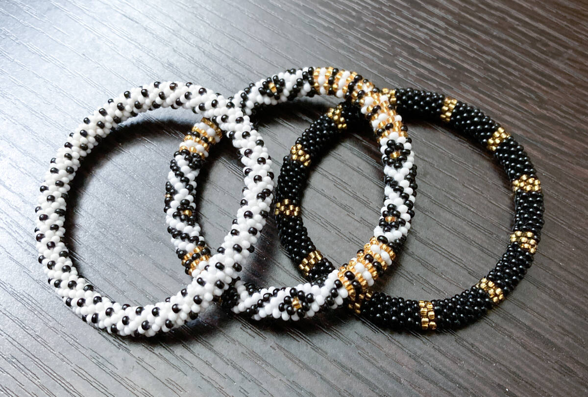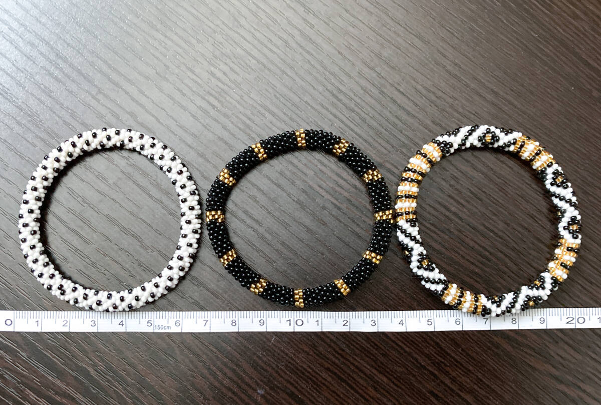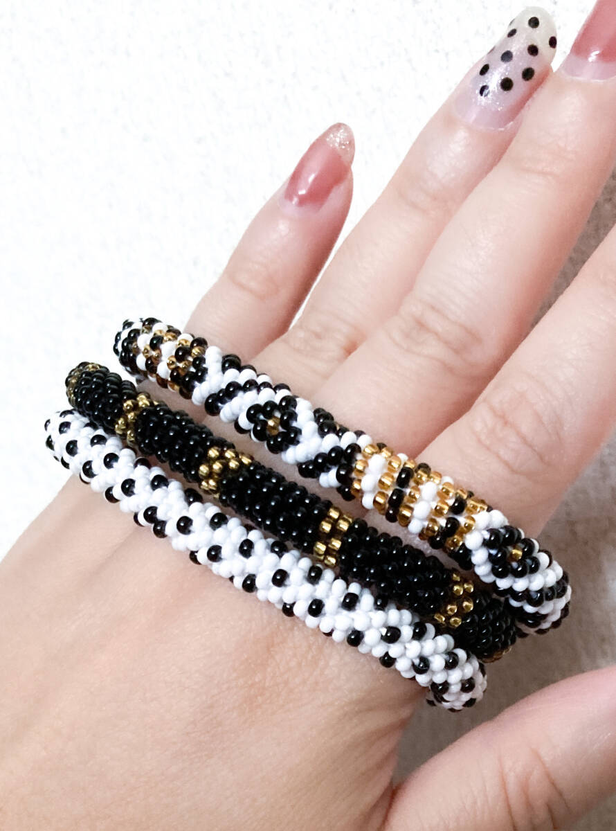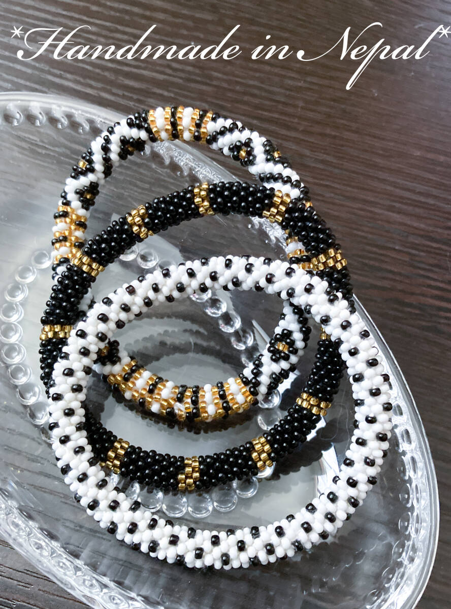 新品 ネパール ハンドメイド ビーズ クロッシェ ブレスレット 2本セット まとめ売り 黒 ゴールド 白 ブラック アクセサリー