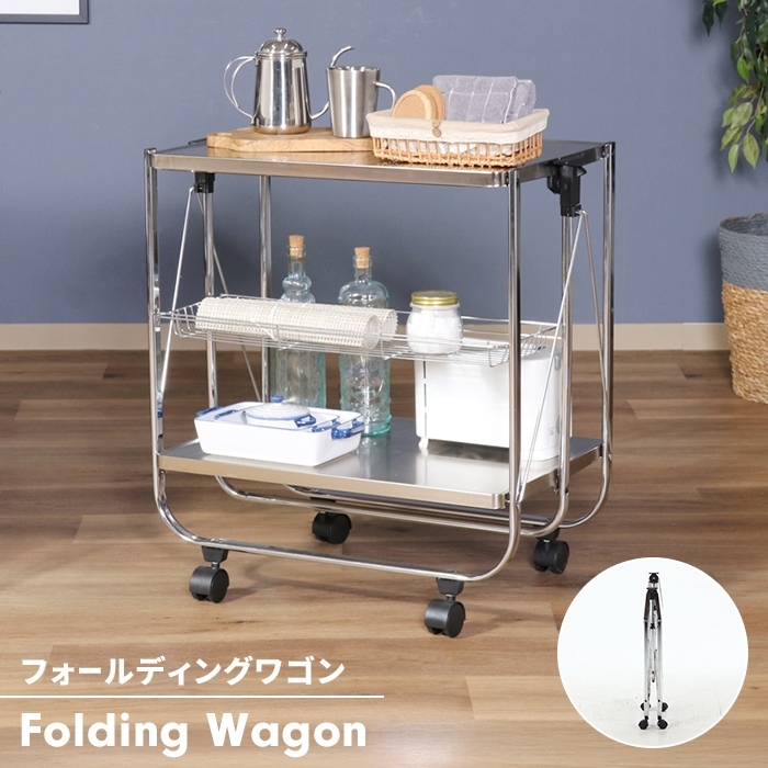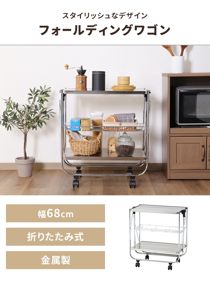 折りたたみワゴン キャスター付き キッチンワゴン 天板 棚付き 幅68 奥行40 マルチワゴン 省スペース 便利 スタイリッシュ フォールディングワゴン 万能ワゴン 折り畳み キャスター付きワゴン デスクワゴン サイドワゴン 収納用品 カゴ付き たためる コンパクト マルチに使える キッチン ダイニング シルバー |