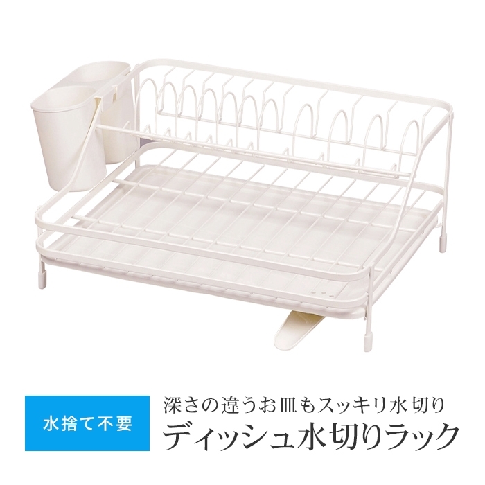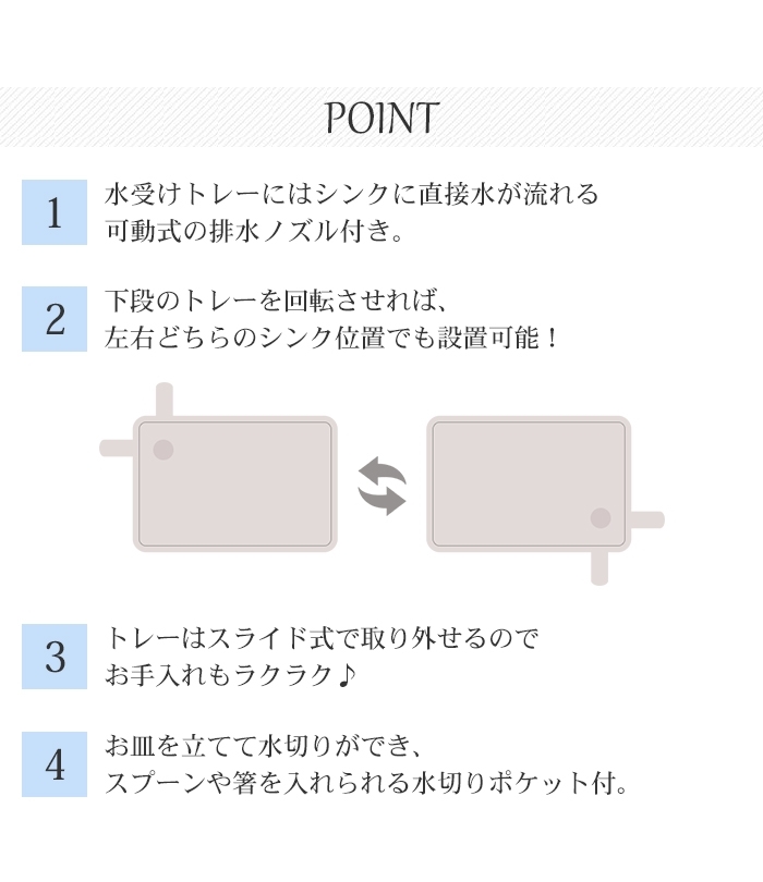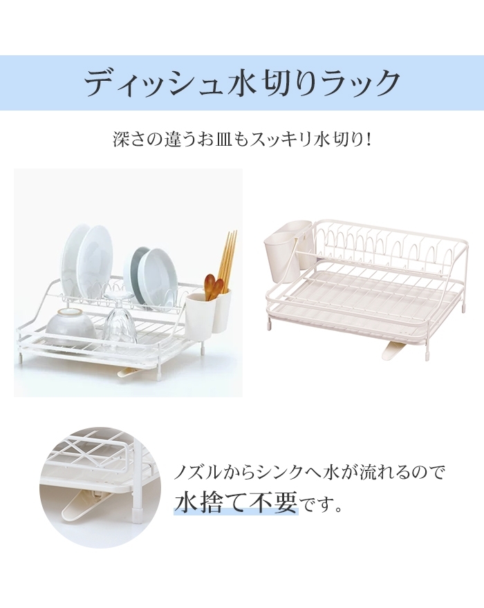 | 水捨て不要!水が流れる水切りラック。 傾斜のある水受けトレーはシンクに直接水が流れる可動式の排水ノズル付き。 トレーを回転させれば左右どちらのシンク一でも設置可能。 トレーはスライド式で取り外せるのでお手入れもラクラク。 箸やスポーンが入る水切りポケット付き。 シンプルなデザインと清潔感のあるカラーでキッチンを明るい印象に。 |