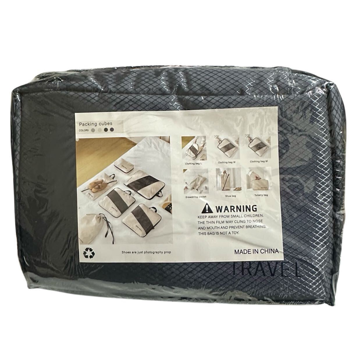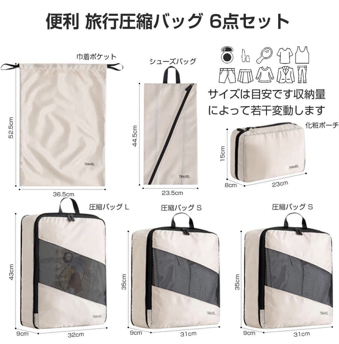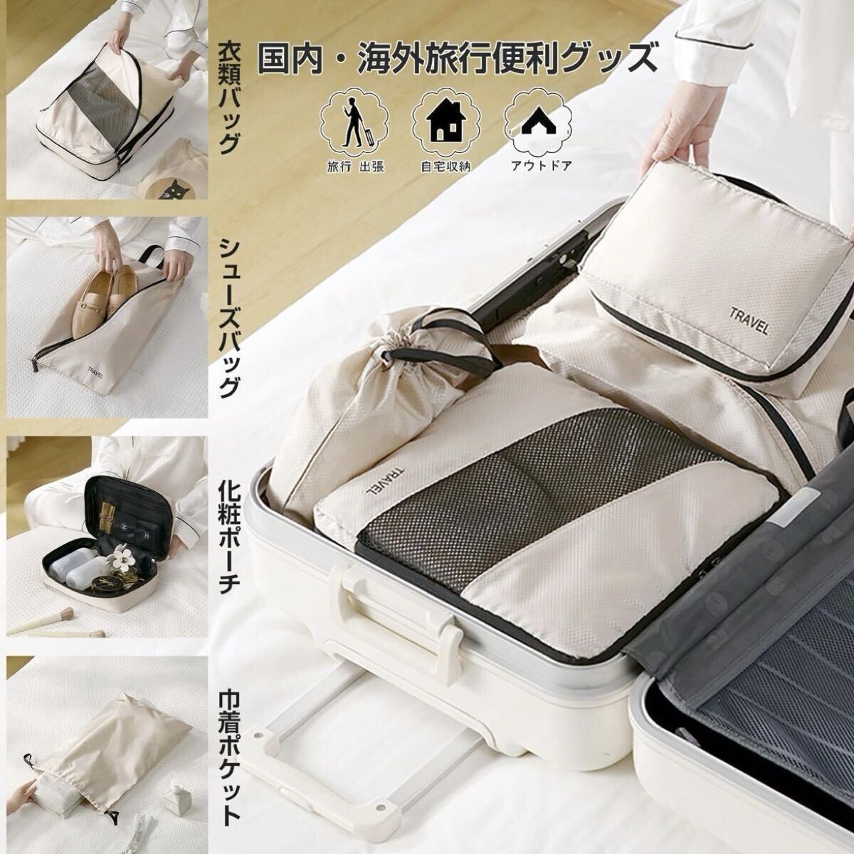 圧縮バッグ3つ+化粧品バッグ1つ+ドローポケット1つ+シューズバッグ1つ。 強化ポリエステル生地。