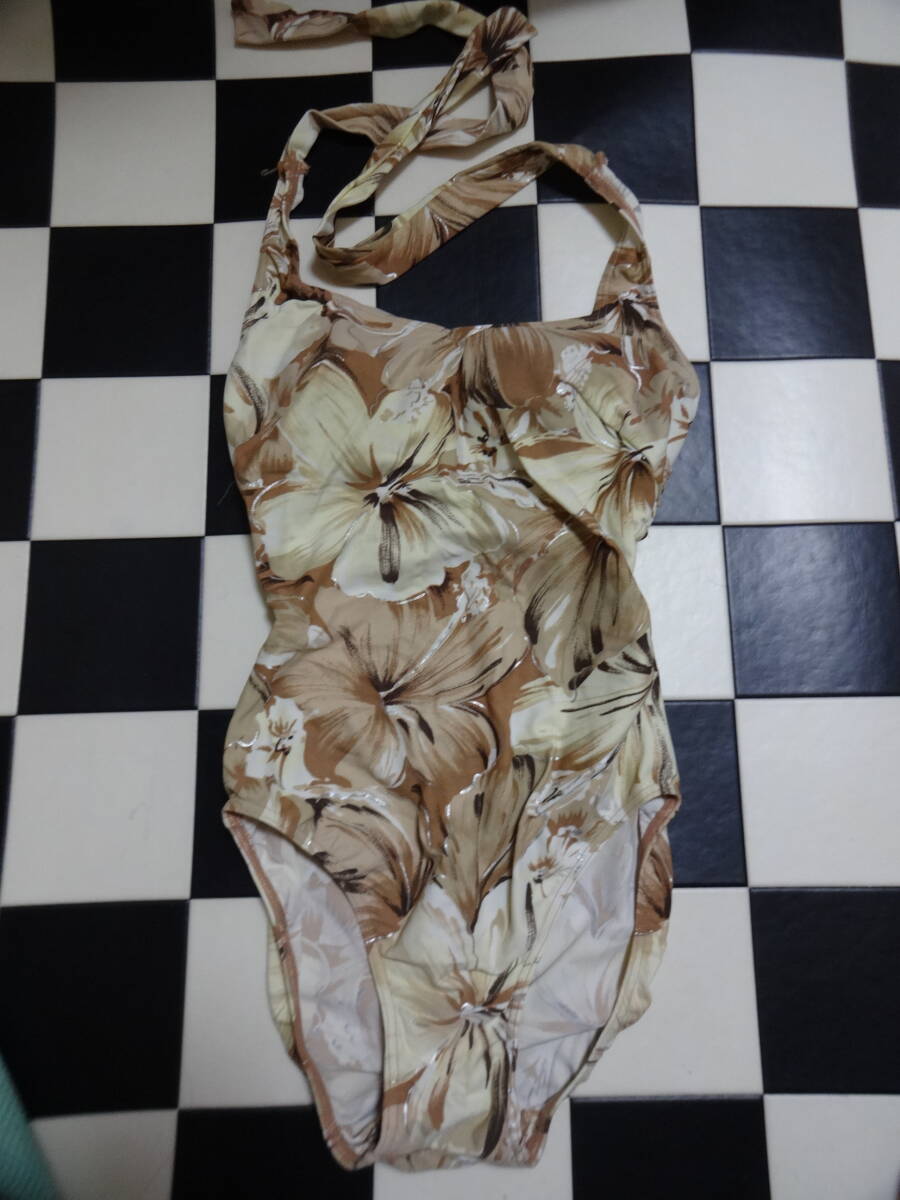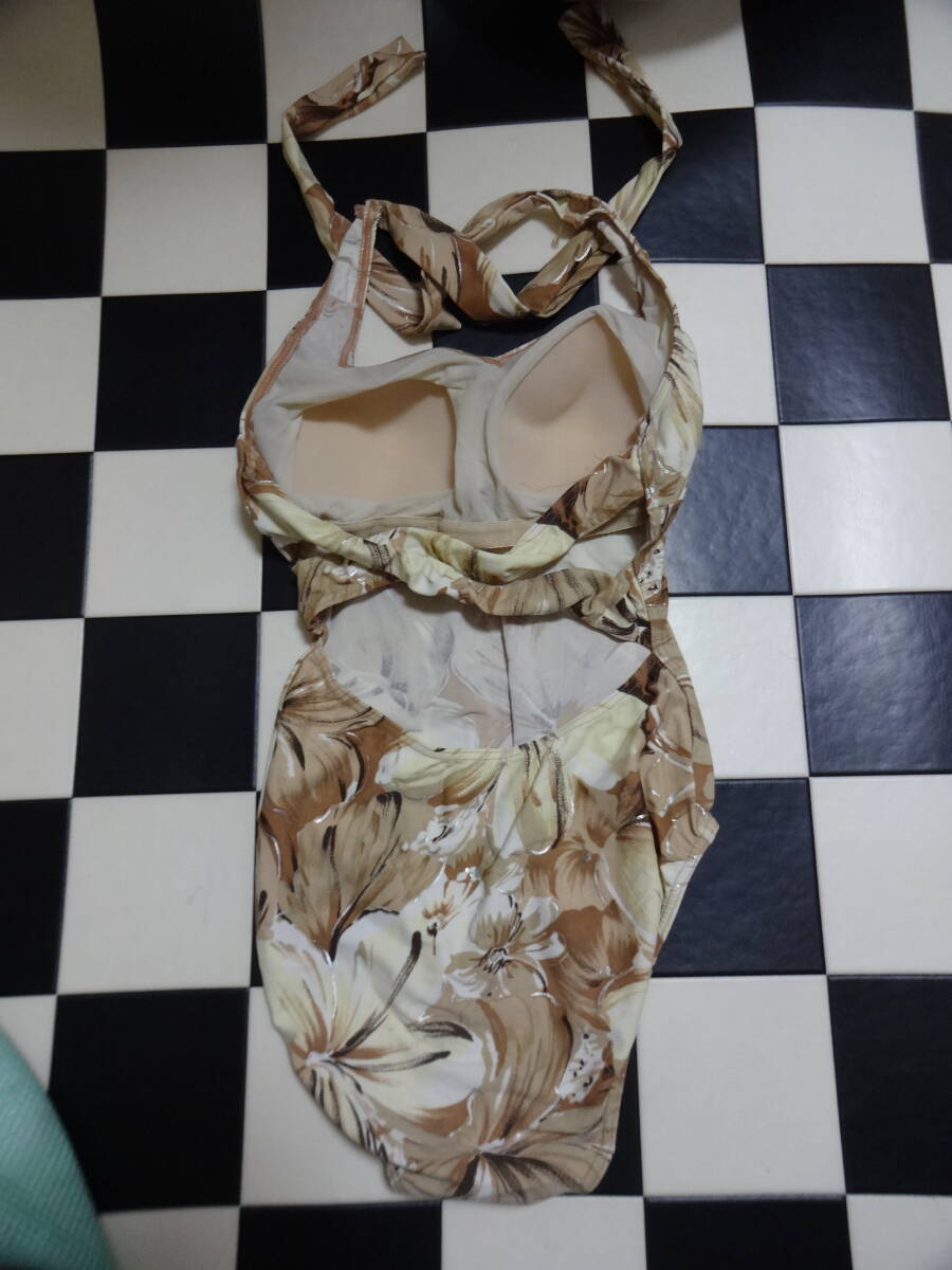 RIOKA 女性水着ワンピース D7363 薄い茶系花柄 ホルターネック