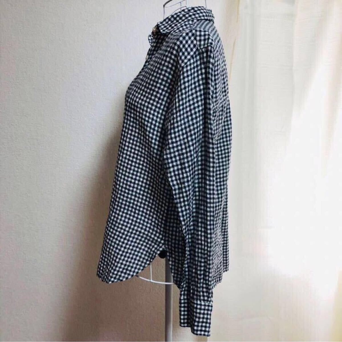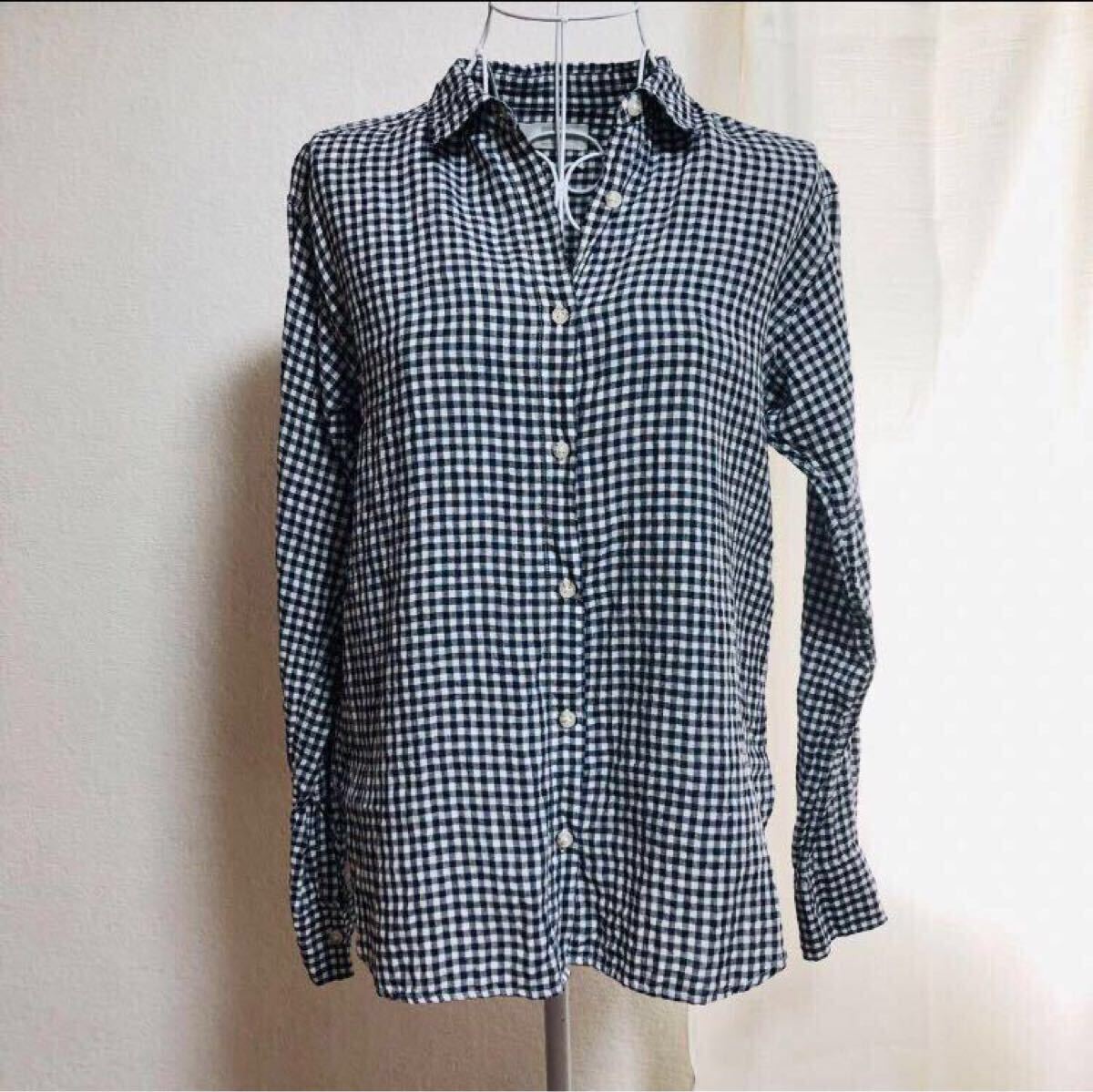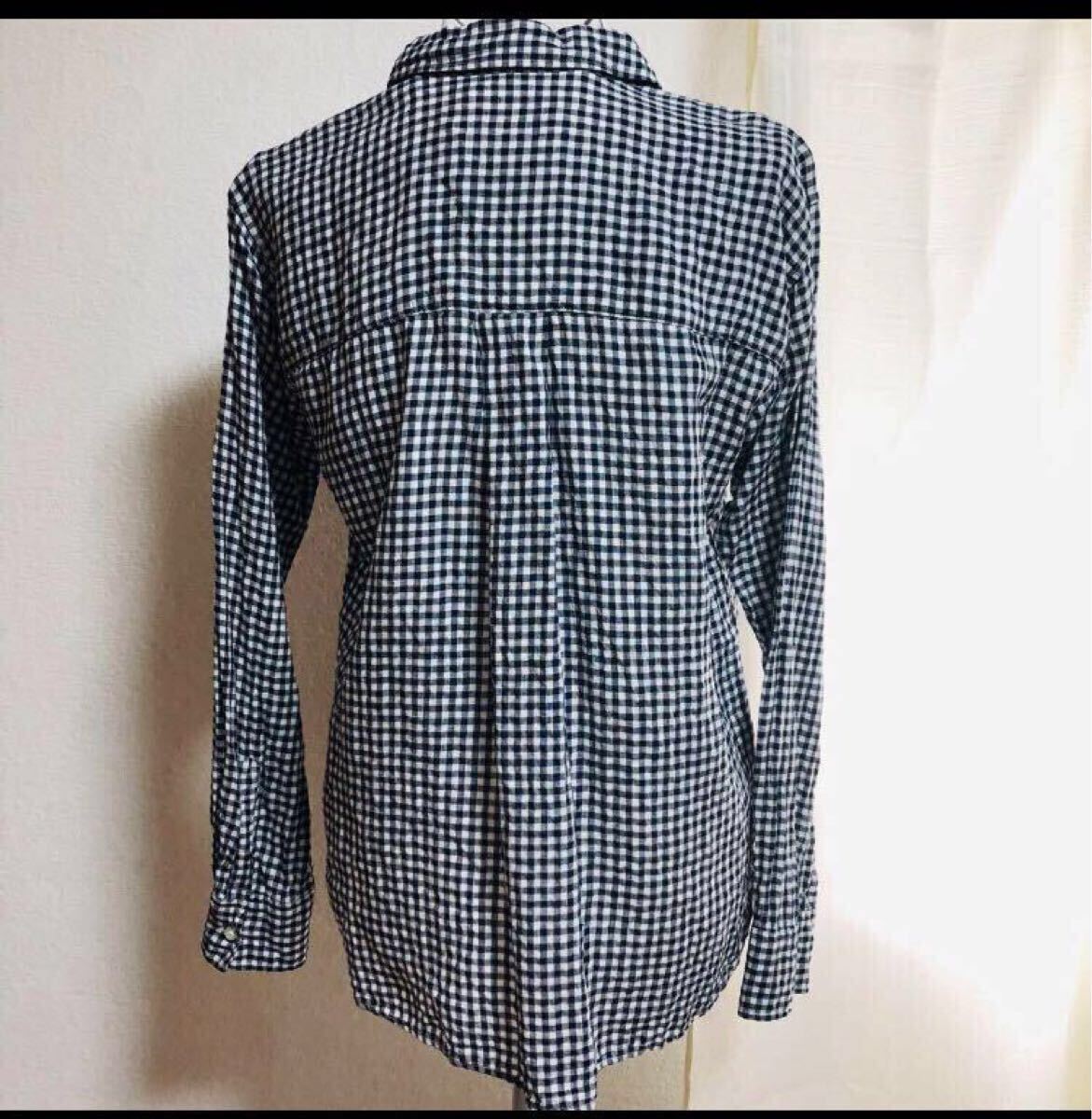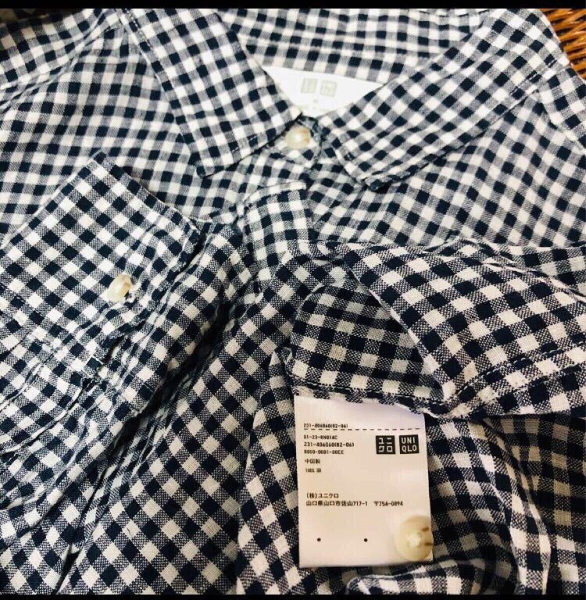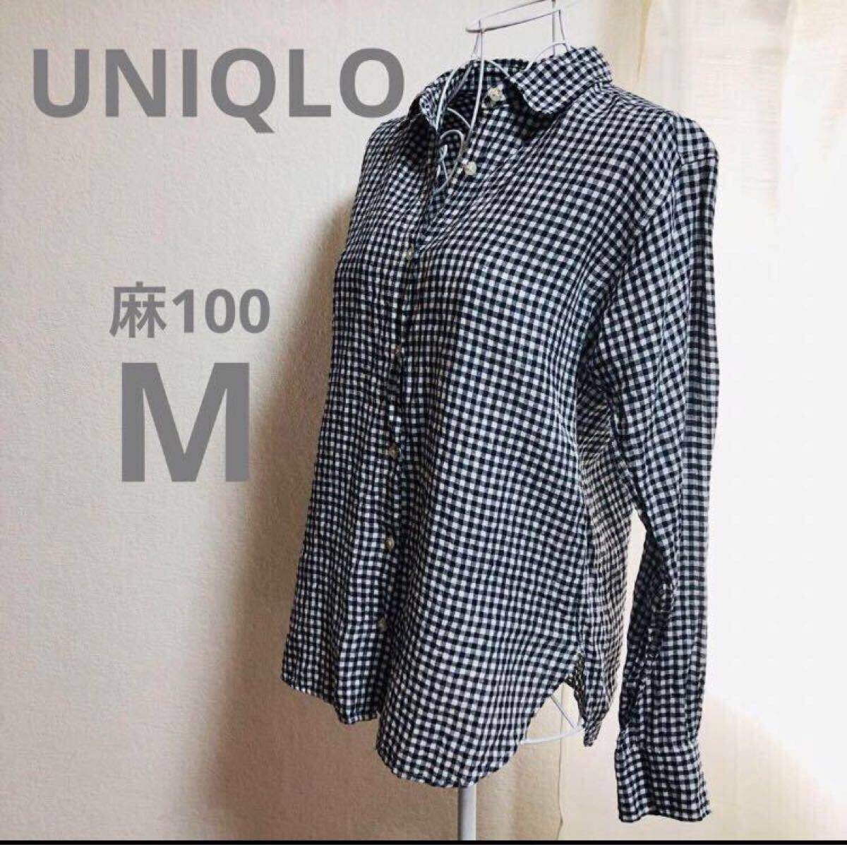 ◆ ユニクロ リネン100 ギンガムチェック 長袖ブラウス Mサイズ、ネイビー×白