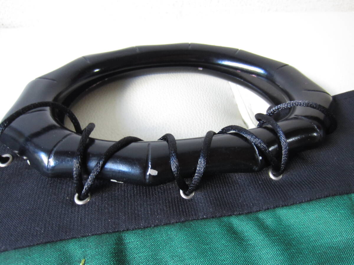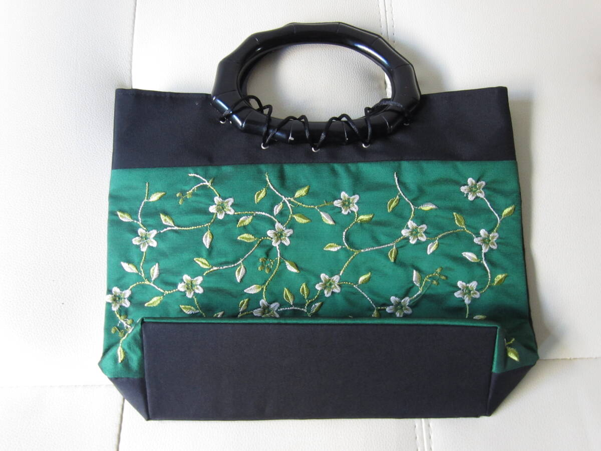 グリーン地に花柄の刺しゅうがアクセントになったバッグ。