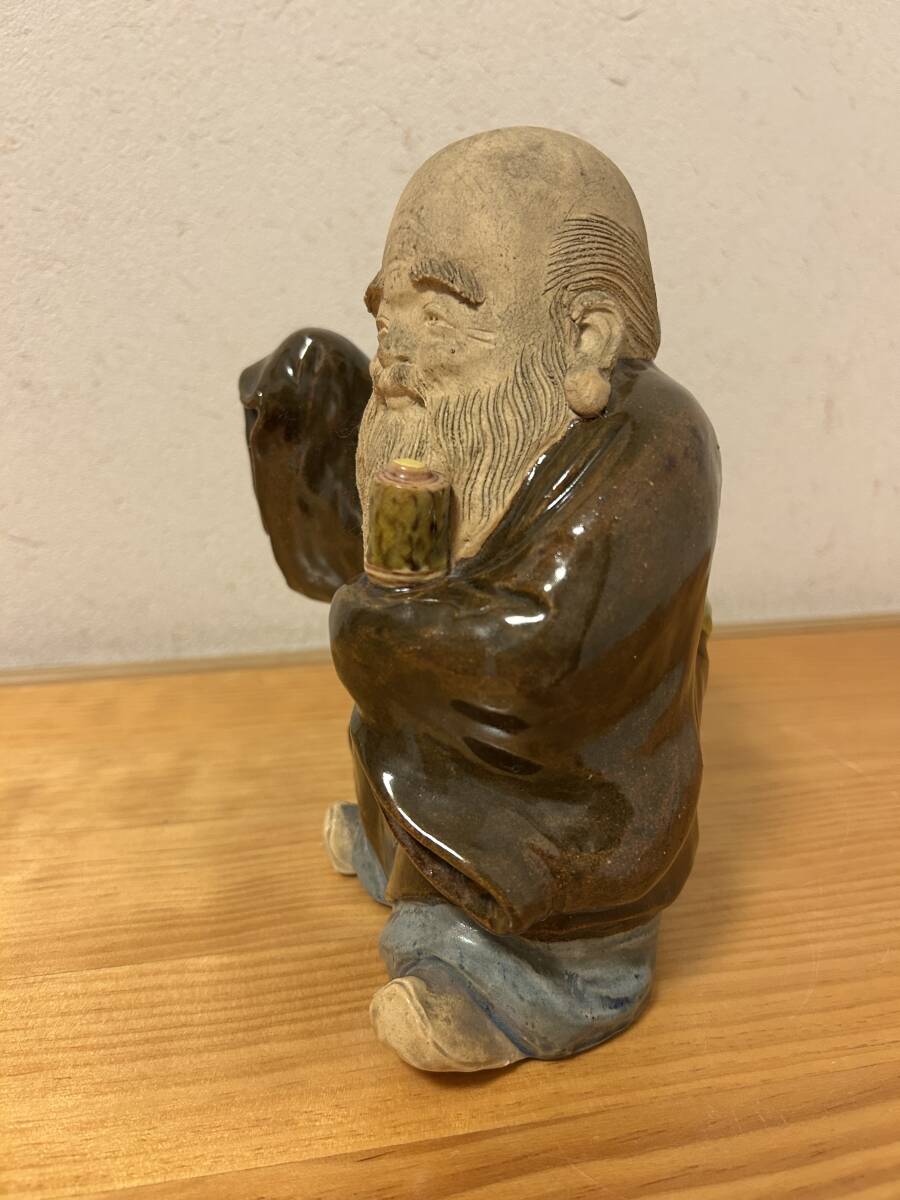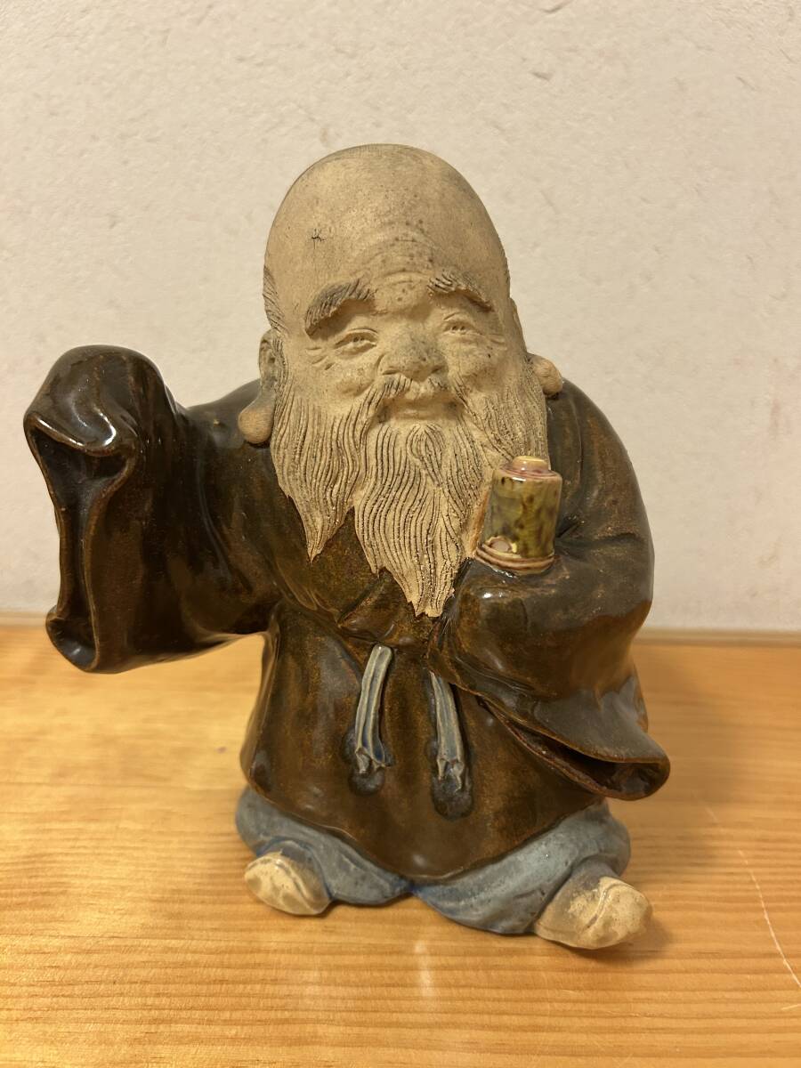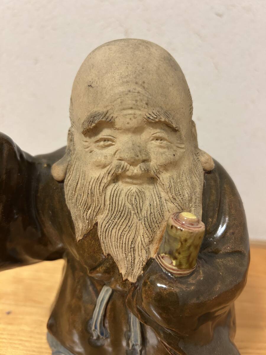 大変珍しい、仏教美術 寿老人 福禄寿 七福神 骨董品 古美術品 中古品 陶器製 底に銘あり です。 左手には巻物(人々の寿命?)を持っています。幸福・財宝・長寿の縁起物として、貴方(貴女)のコレクションアイテムに是非どうぞ。 大きさは縦18.5cm横15cm奥行9cm重さ989g位で、若干の汚れはありますが状態は概ね良好です。