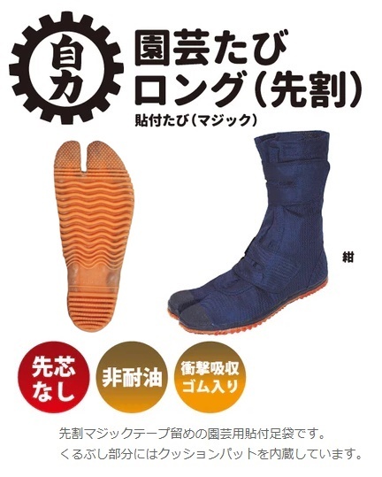 日進ゴムNISSHIN RUBBER日進ゴムの地下足袋「自力」シリーズ自力園芸たびロング 先割 紺品番:園芸たびロングサイズ:26.5cm■特長・先割マジックテープ留めの園芸用貼付足袋です・くるぶし部分にはクッションパットを内蔵しています。・先芯なし・非耐油・衝撃吸収ゴム入り