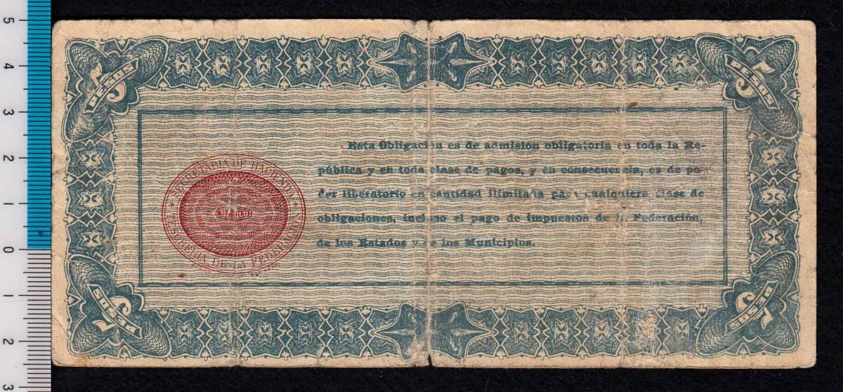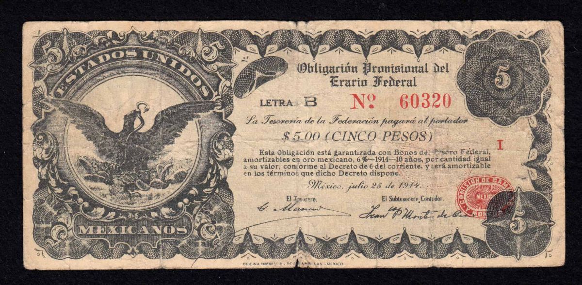 *[令]Pick#S714/メキシコ革命期紙幣 暫定政府 メキシコシティ 5ペソ(1914)[1180]7o1