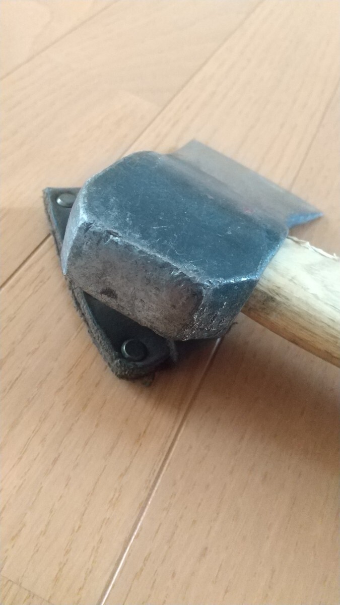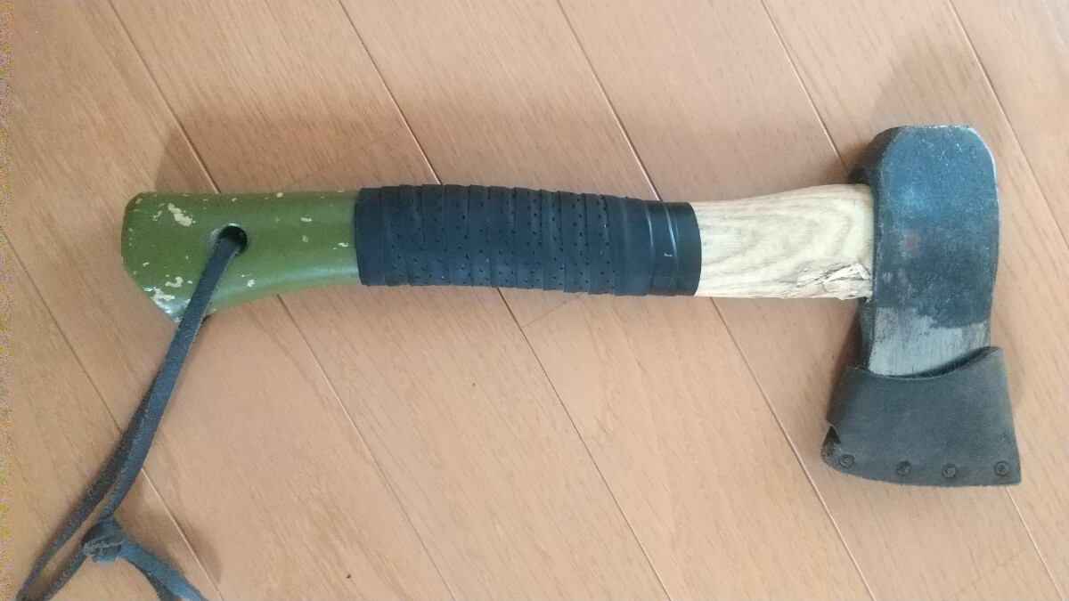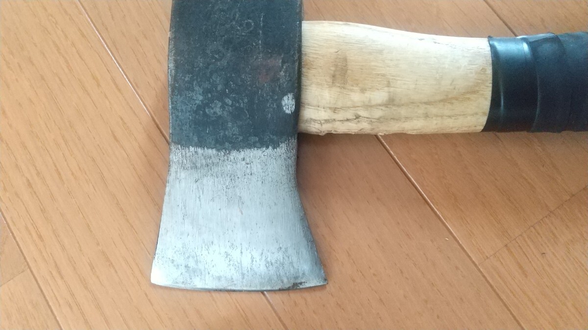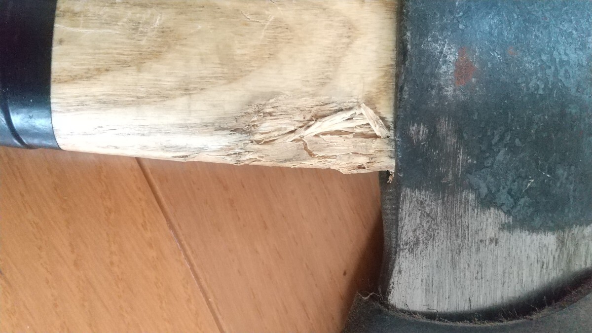 3年程前にAmazonで新品購入したプランデイの斧です。キャンプで薪割りに15回程度使用しました。柄の根元付近が薪にあたり削れています。また塗装剥がれもパッと見て分かる程度あります。テニスラケットのグリップテープを巻いて使用していたので、この状態での出品になります。