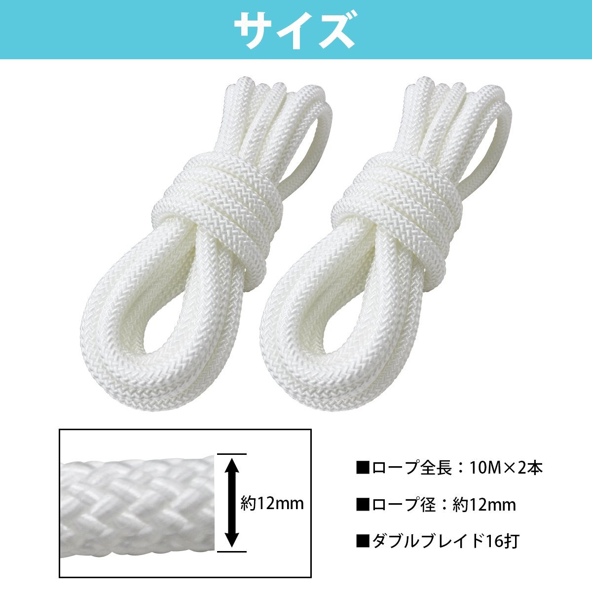 【送料無料】16打 12mm 10m 2本セット 計20m 係留ロープ フェンダーロープ ダブルブレイド 白/ホワイト マリン ロープ 船 係船 12ミリ
