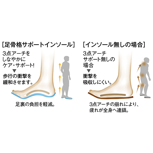 ・3つのアーチで足骨格をサポートし、外反母趾や偏平足などの足の障害も予防します。
