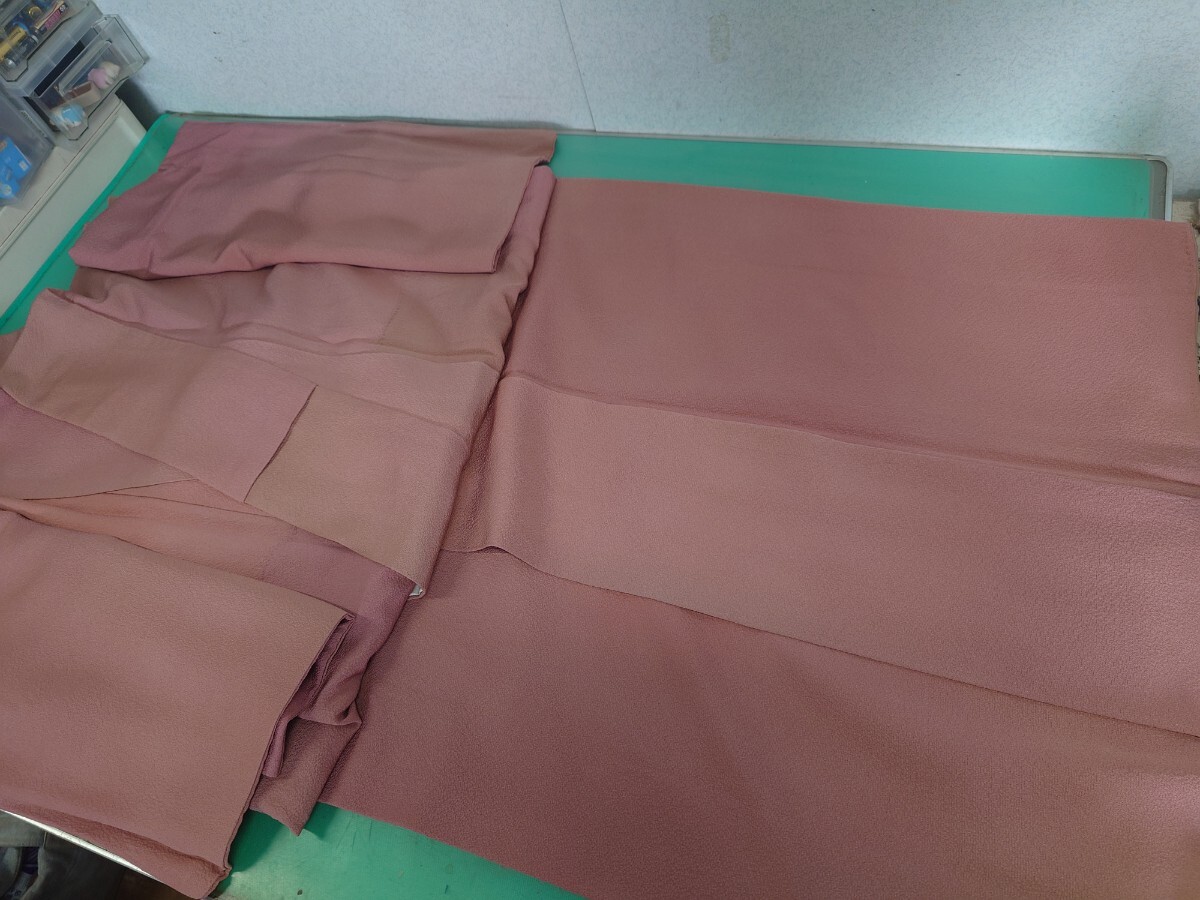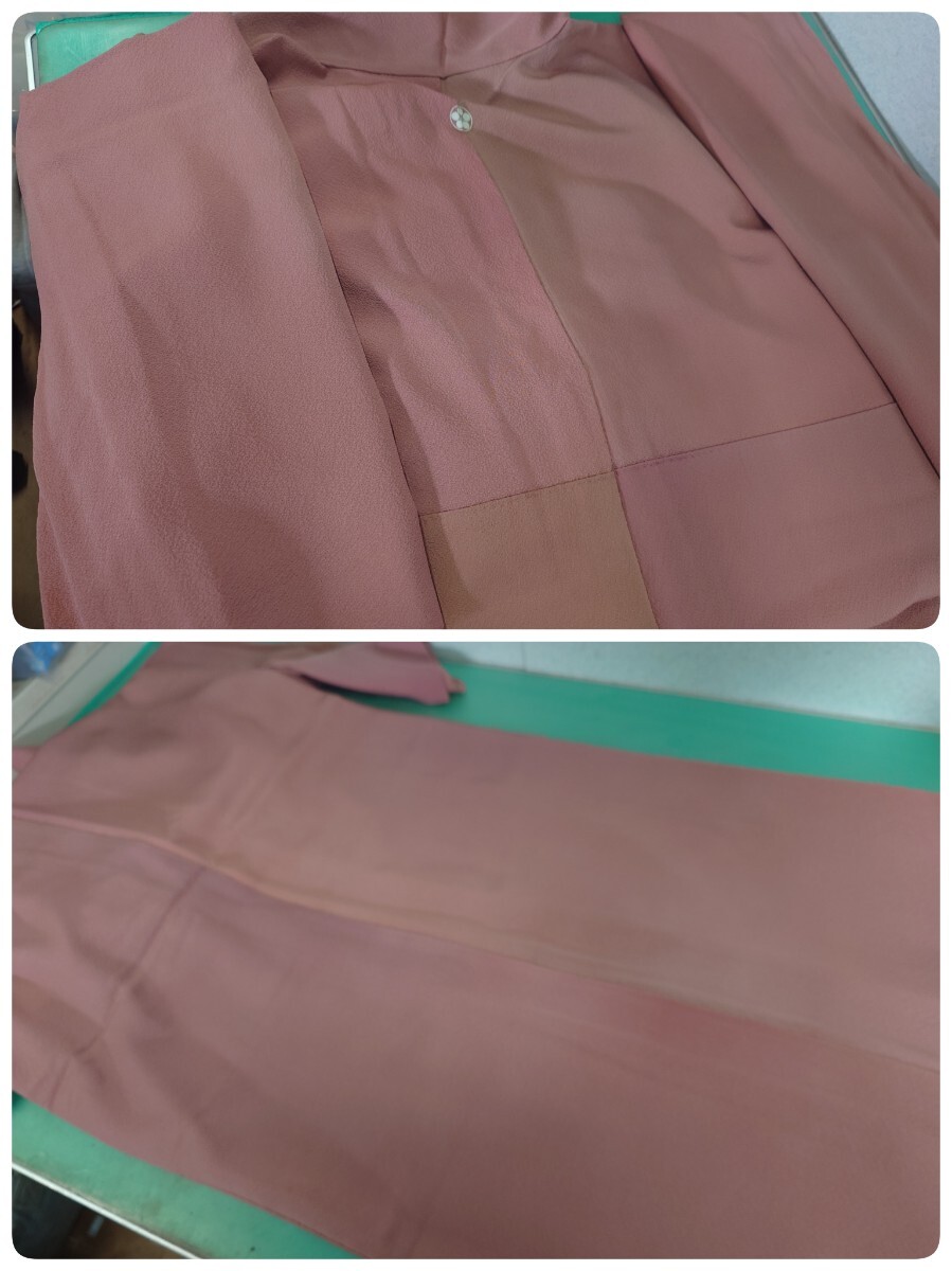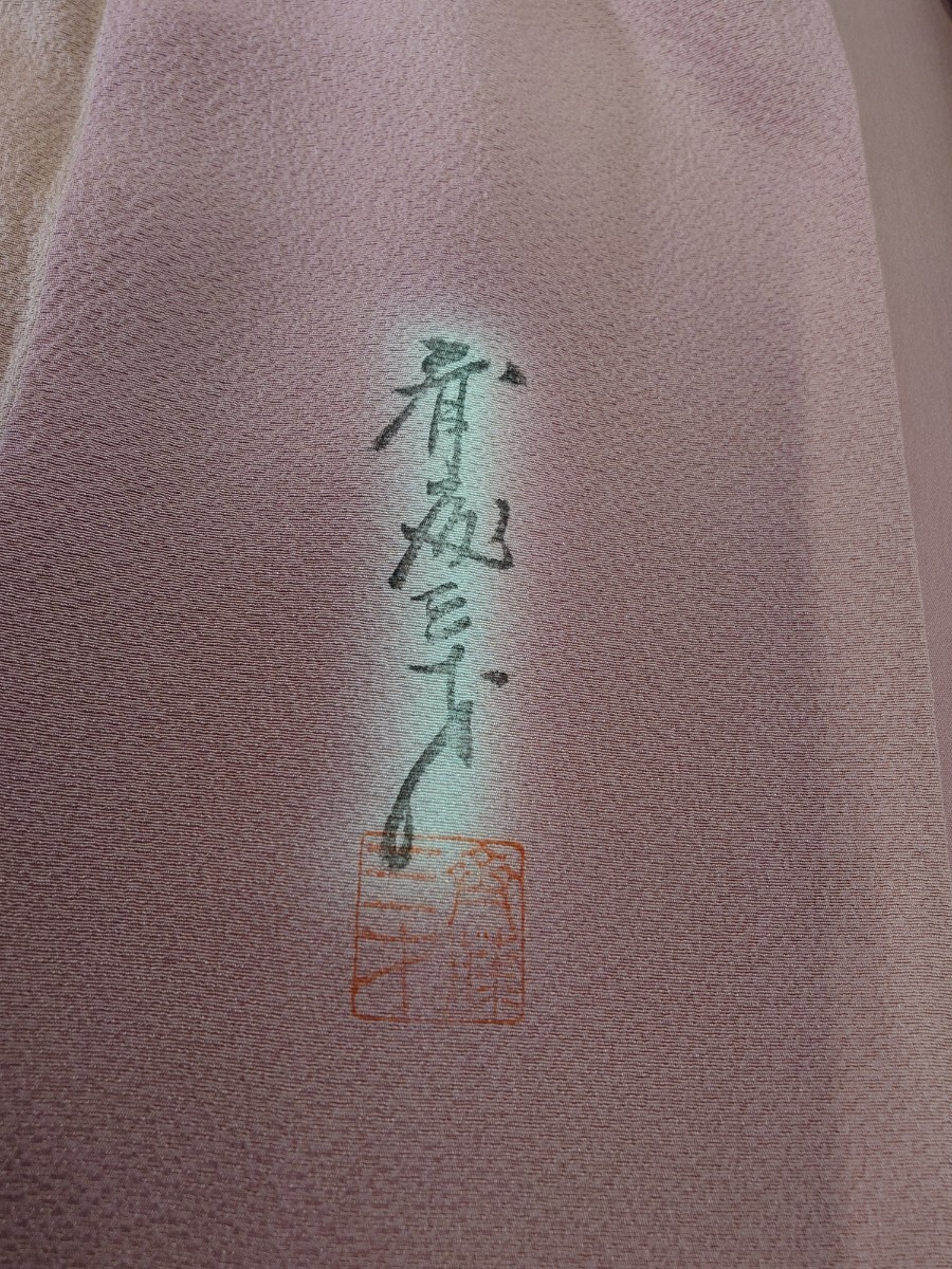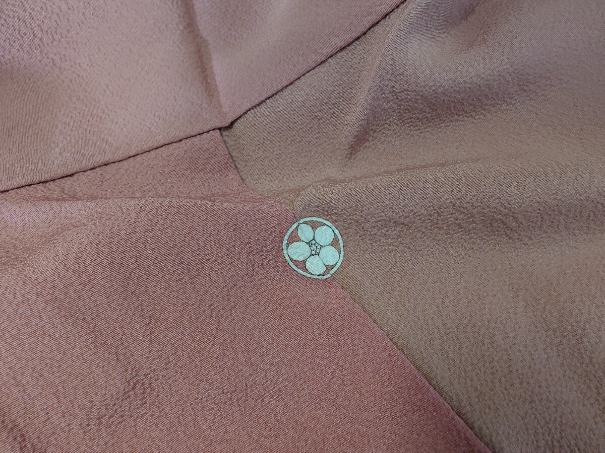 ● 126 在銘 落款 斉藤三才 ツートン グラデーション ちりめん 色無地 一つ紋 丸に梅鉢 くすみピンク系 身丈156cm 中古 ③