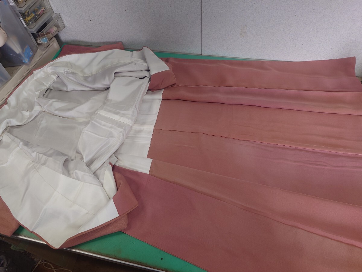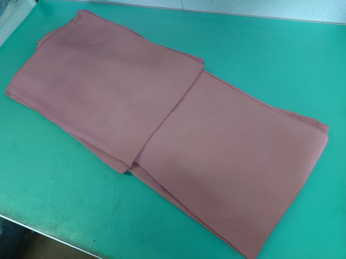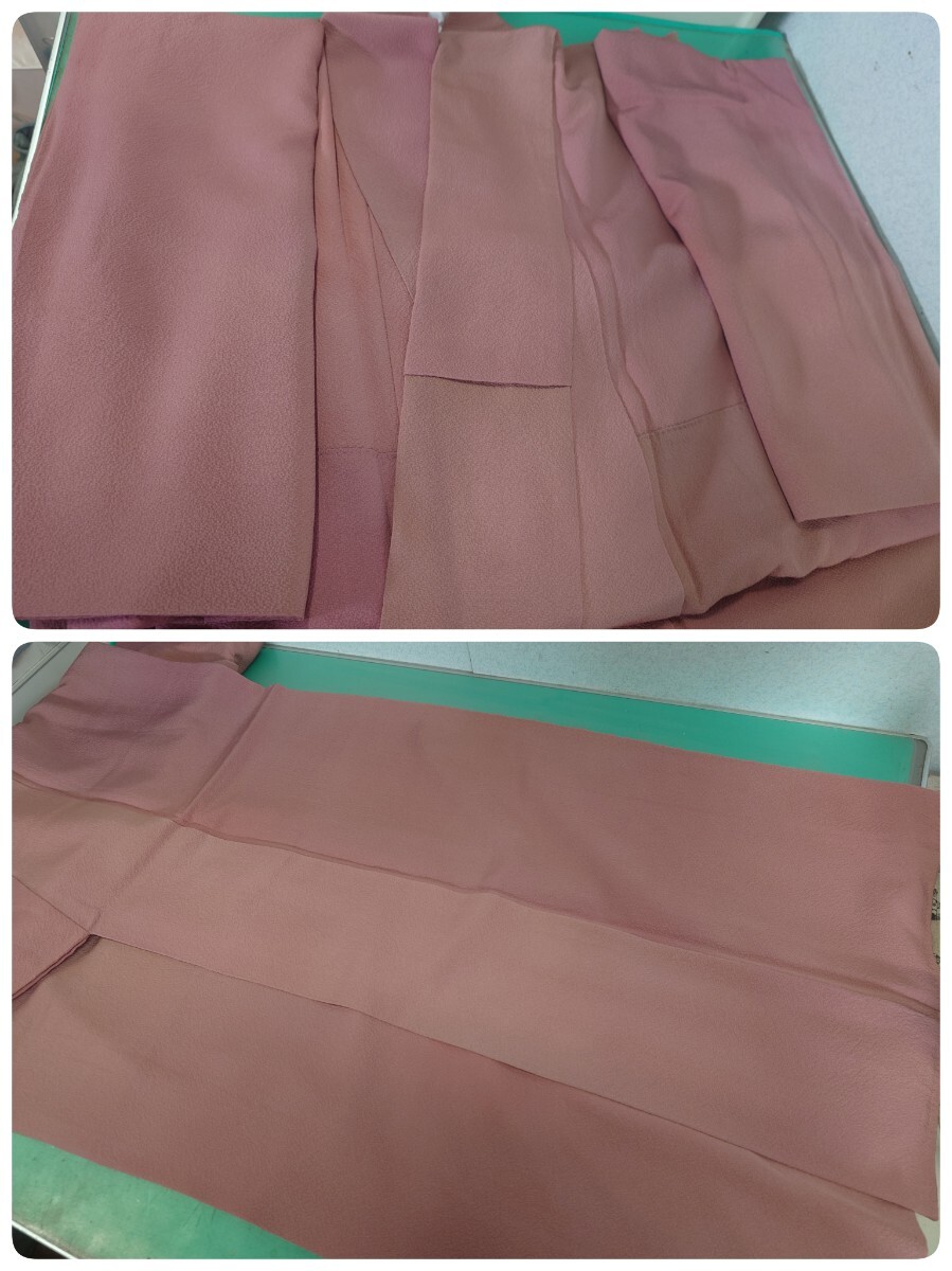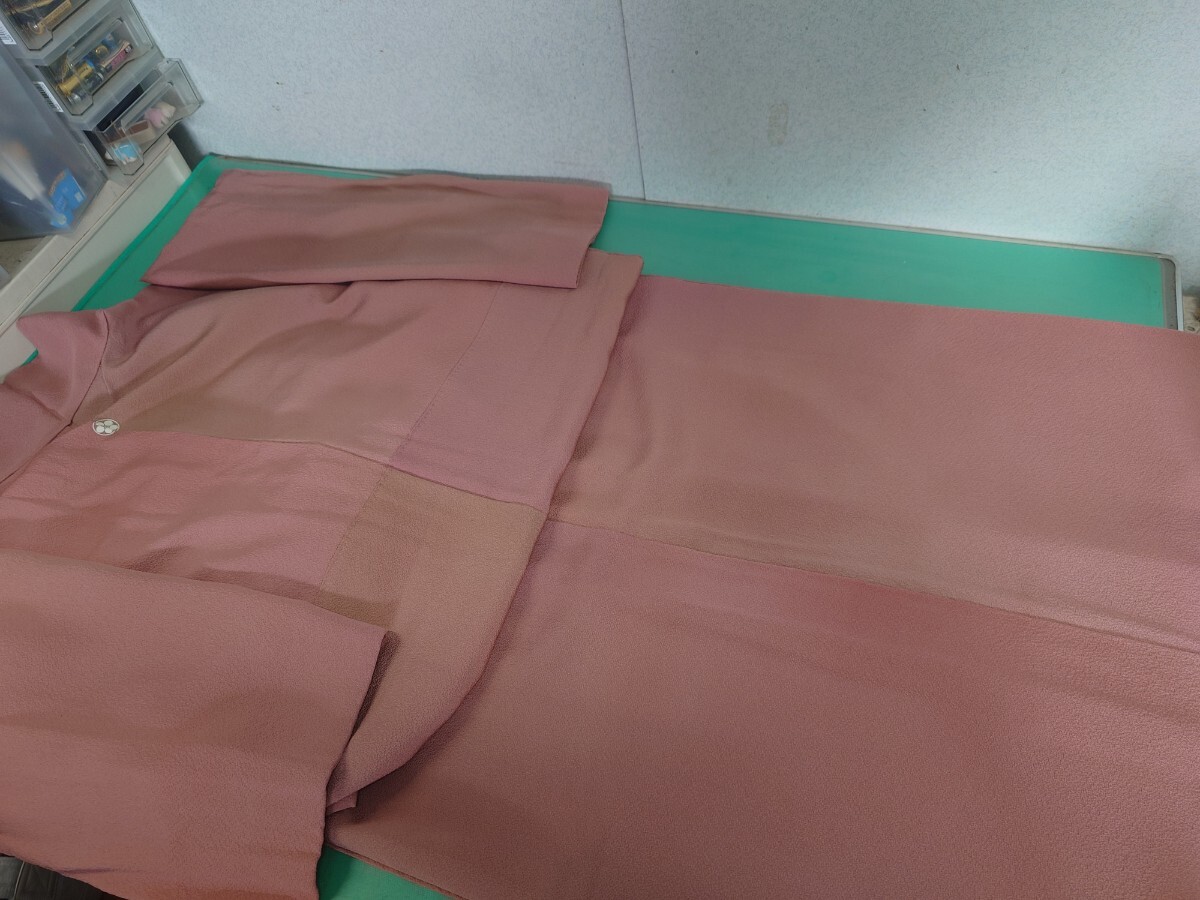 ● 126 在銘 落款 斉藤三才 ツートン グラデーション ちりめん 色無地 一つ紋 丸に梅鉢 くすみピンク系 身丈156cm 中古 ③