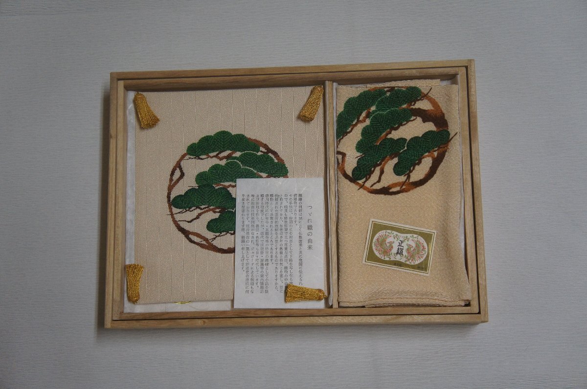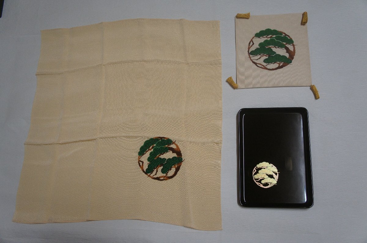 商品名老松模様本綴れ袱紗正絹縮緬風呂敷本漆切手盆箱入り[E16387]